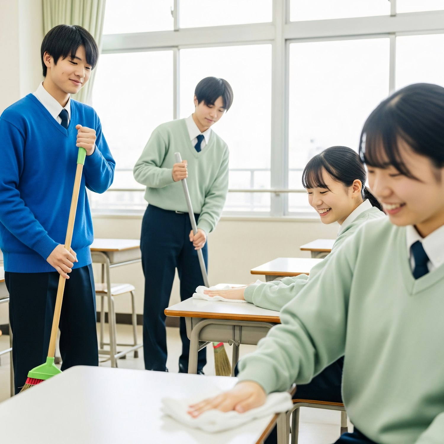 Students in school uniforms cleaning a bright classroom together, smiling and working as a team with brooms and cloths.