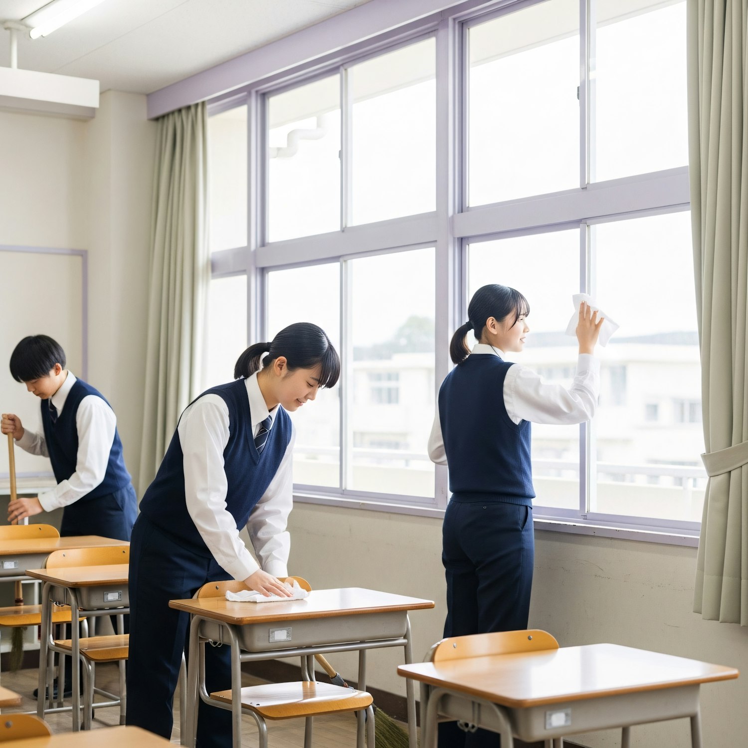 Students in school uniforms clean a classroom, wiping desks, windows, and sweeping the floor, showcasing teamwork and responsibility.