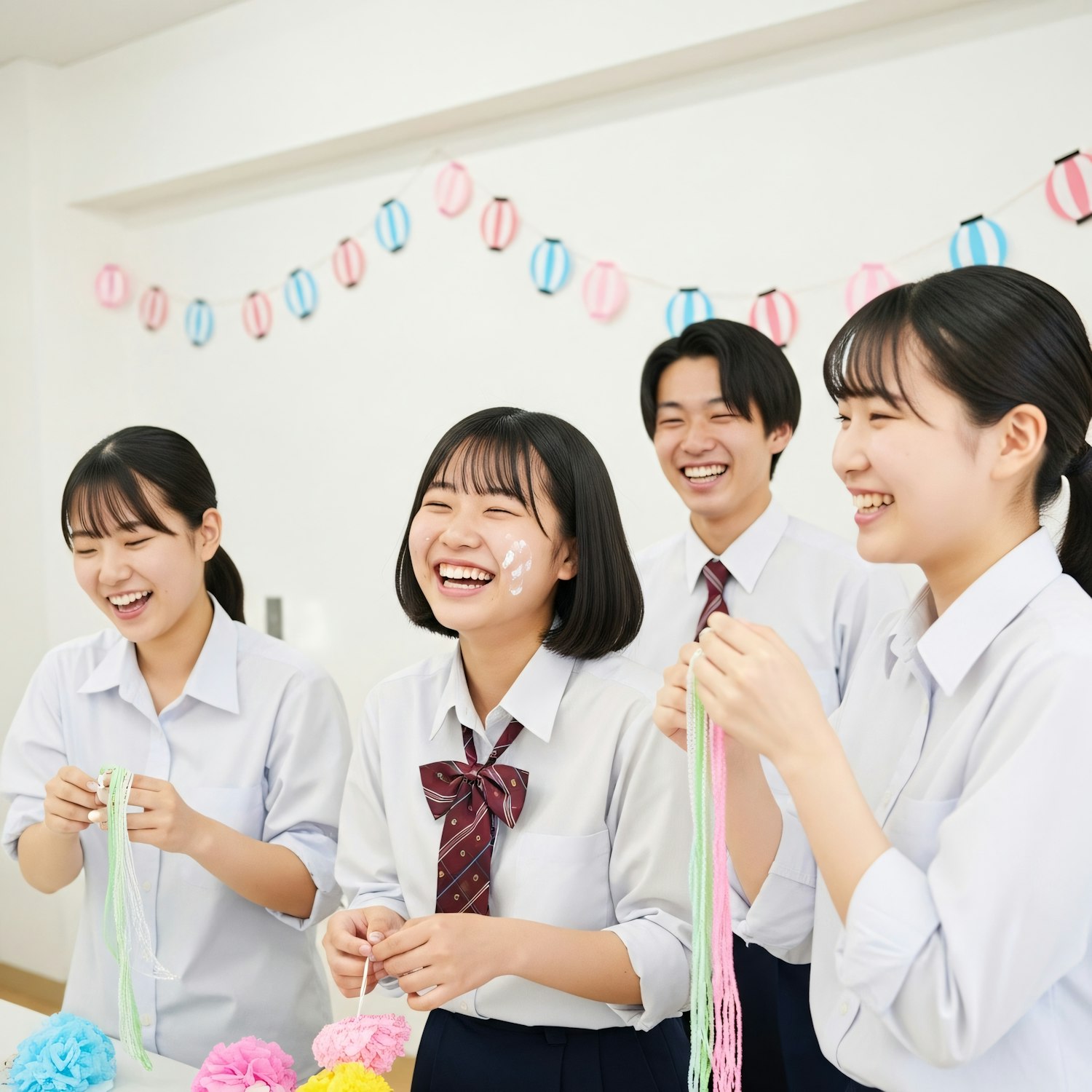 A group of students in uniforms enjoying a craft activity with colorful materials in a festive classroom setting.
