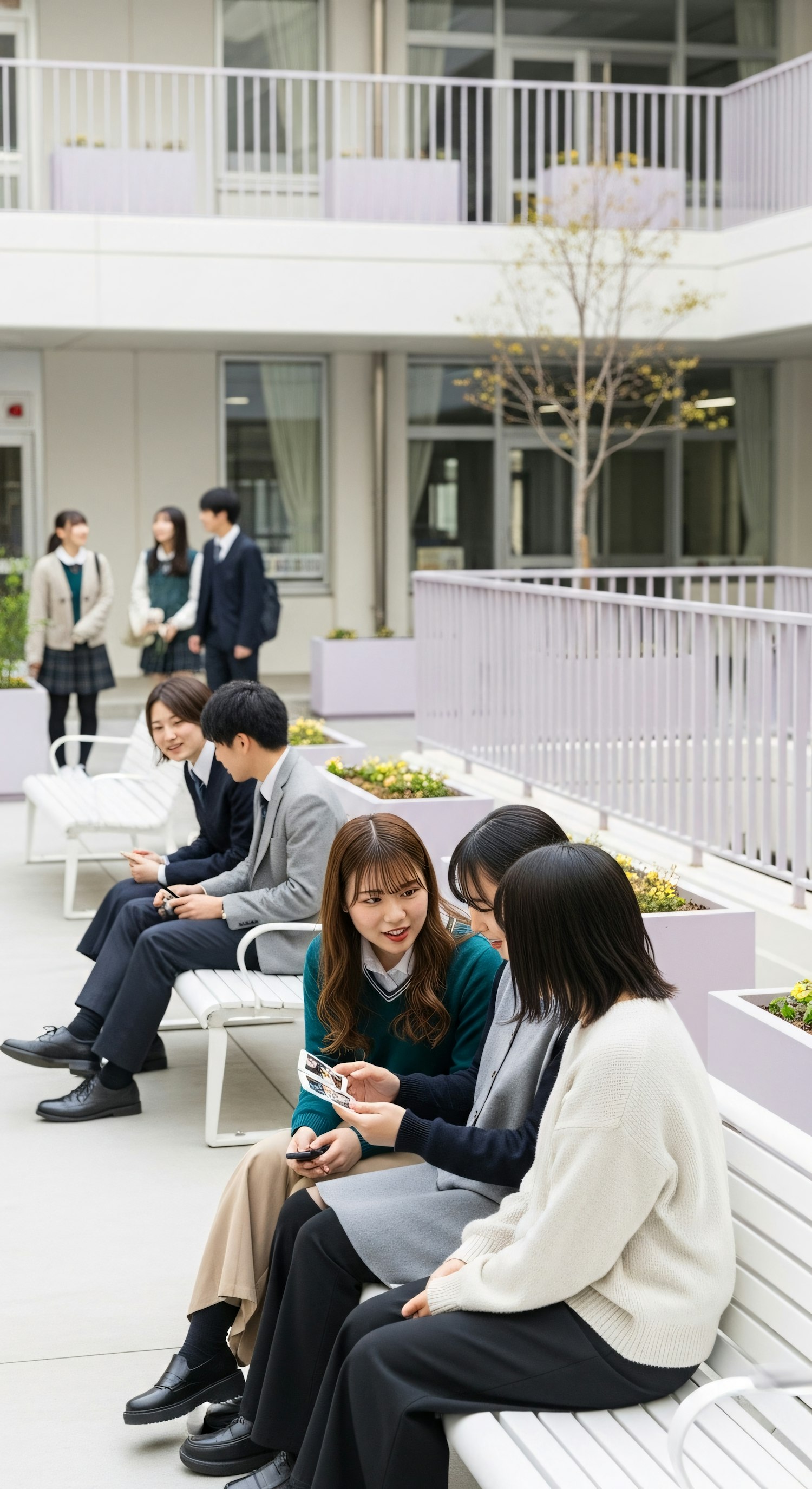 Students in a modern courtyard, chatting and sharing a smartphone, with a relaxed and social atmosphere.