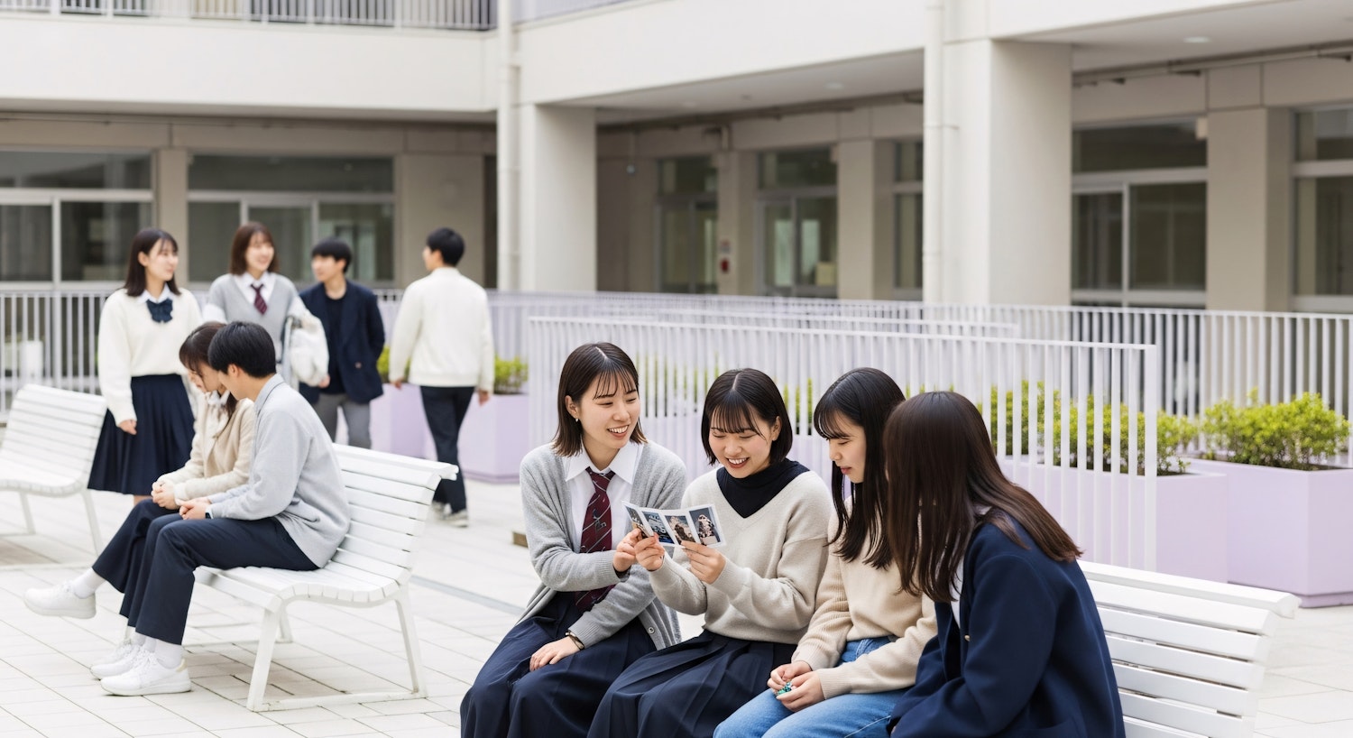 Students enjoying a casual moment in a school courtyard, sharing photos and chatting in a relaxed and friendly atmosphere.