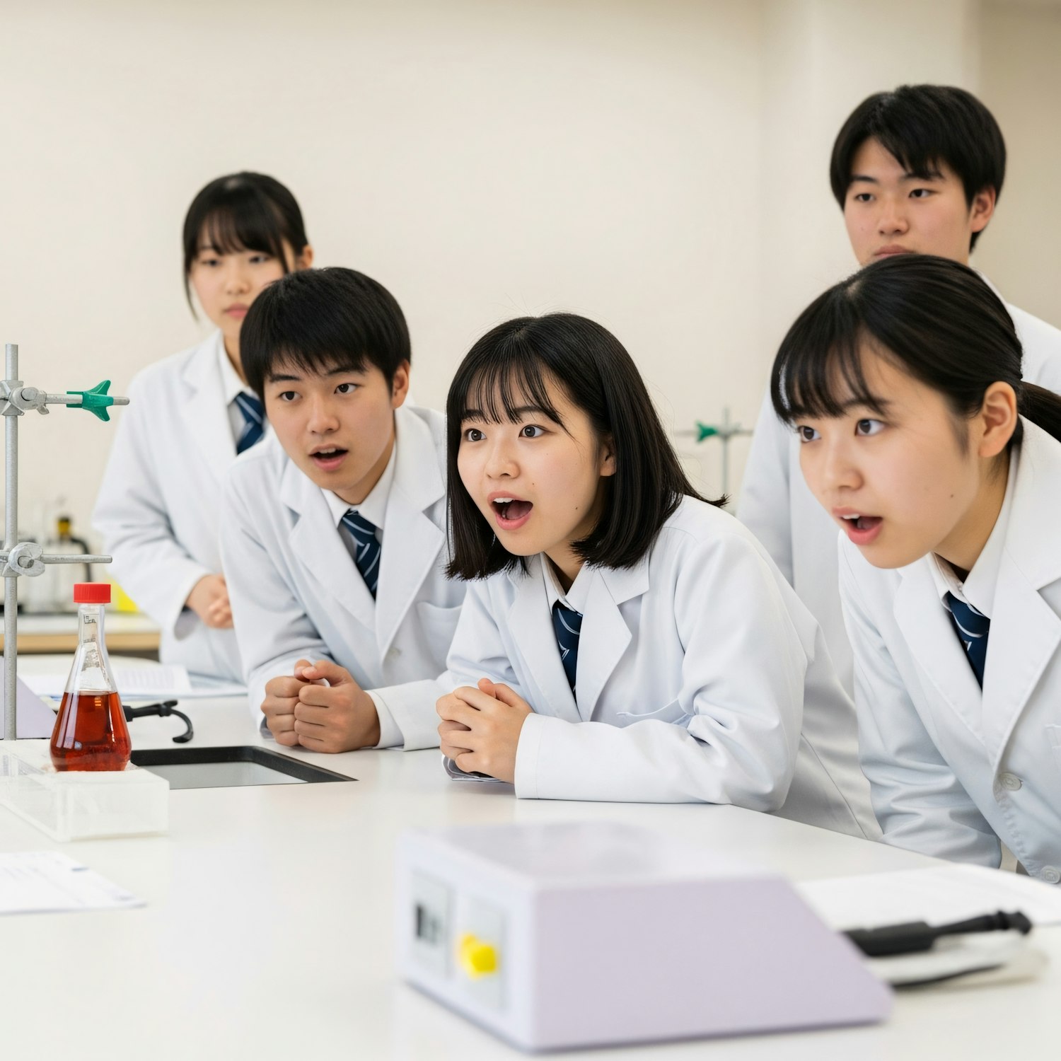 Students in lab coats excitedly observe a science experiment in a bright laboratory, showcasing teamwork and curiosity in learning.