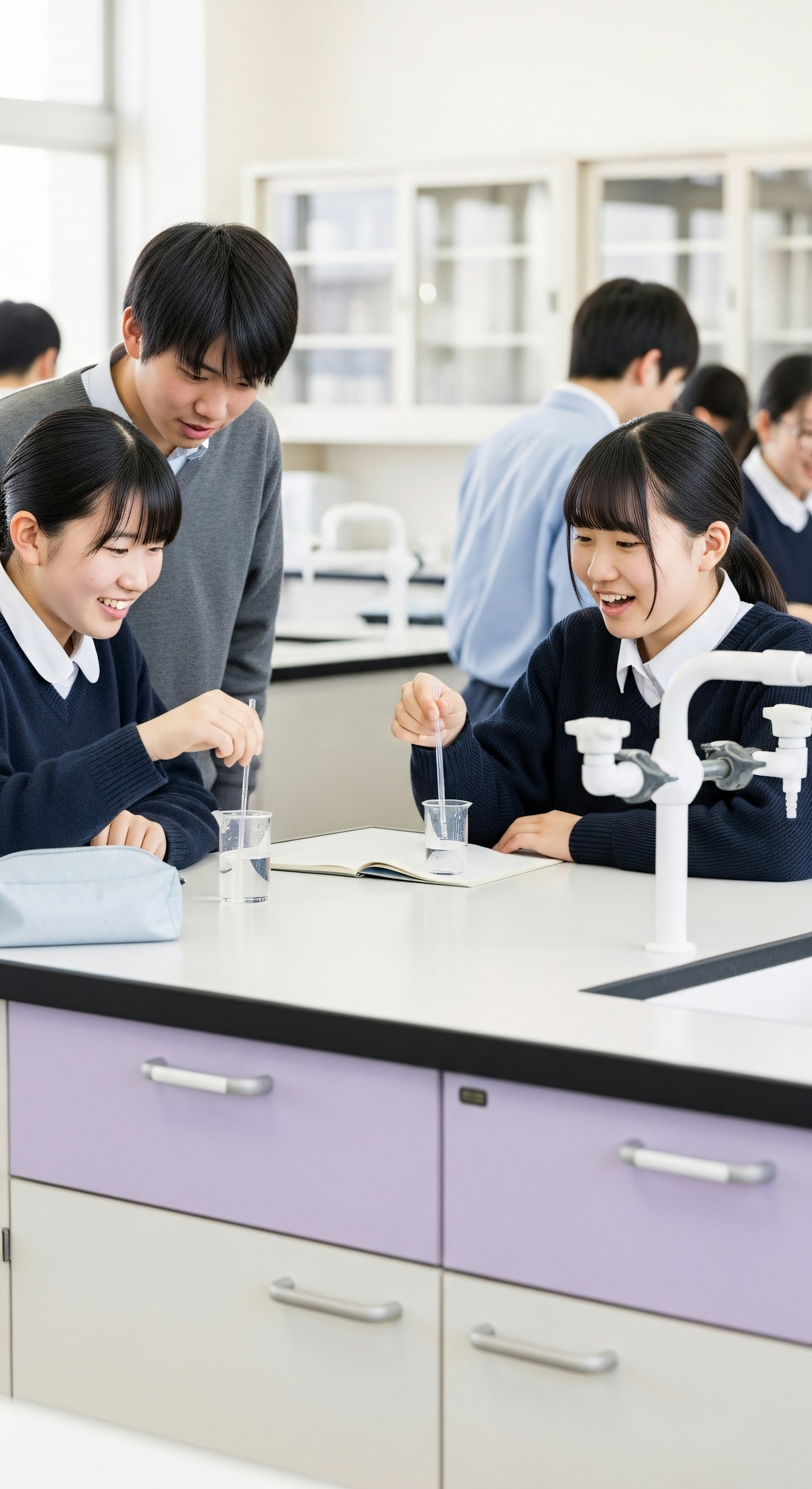 Students in a science lab conducting an experiment with clear liquids, showcasing teamwork and learning in a bright classroom setting.