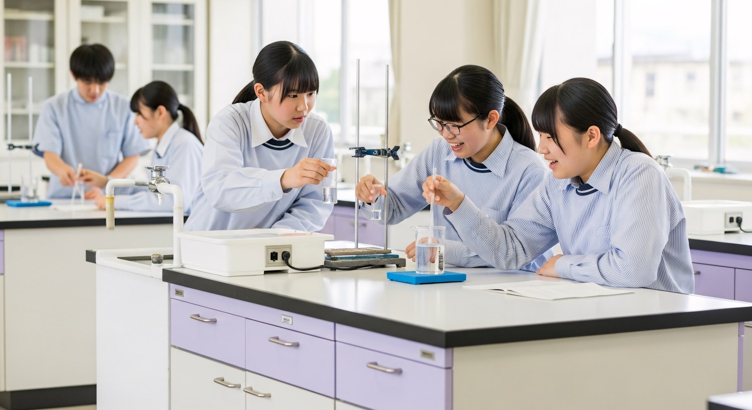 Students in a bright science lab conducting experiments with beakers and equipment, collaborating and learning together.