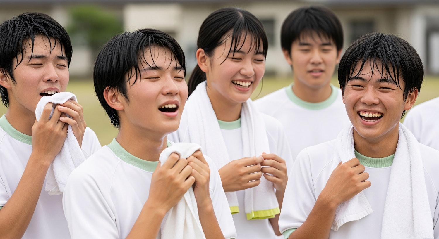 A group of students in white sports uniforms share a joyful moment outdoors, smiling and holding towels after an activity.