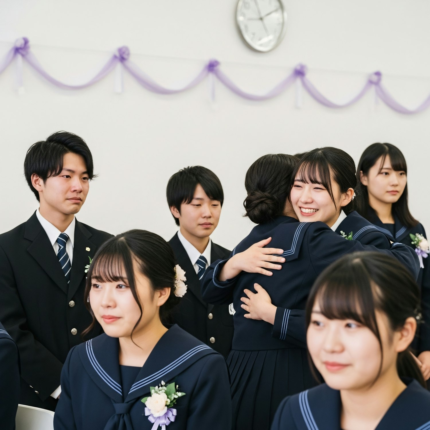 Students in formal uniforms share a heartfelt moment during a school event, with smiles and warm embraces in a decorated room.