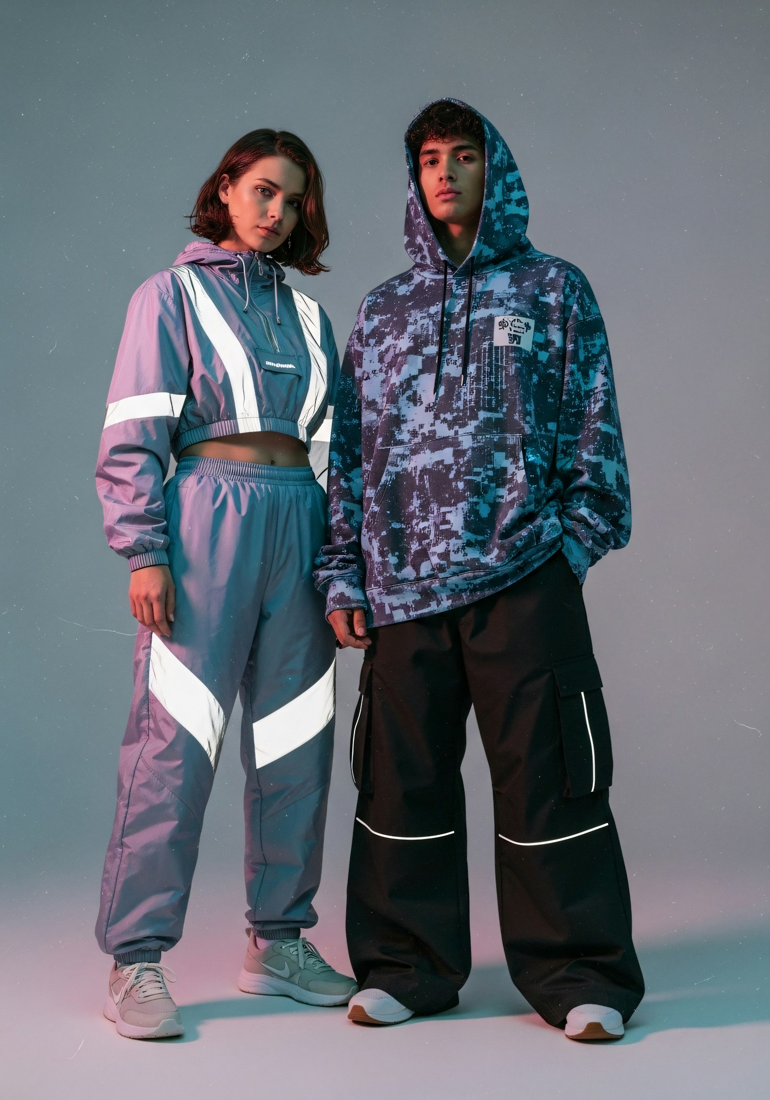 Two individuals in stylish reflective and patterned streetwear pose confidently in a studio with dynamic lighting.