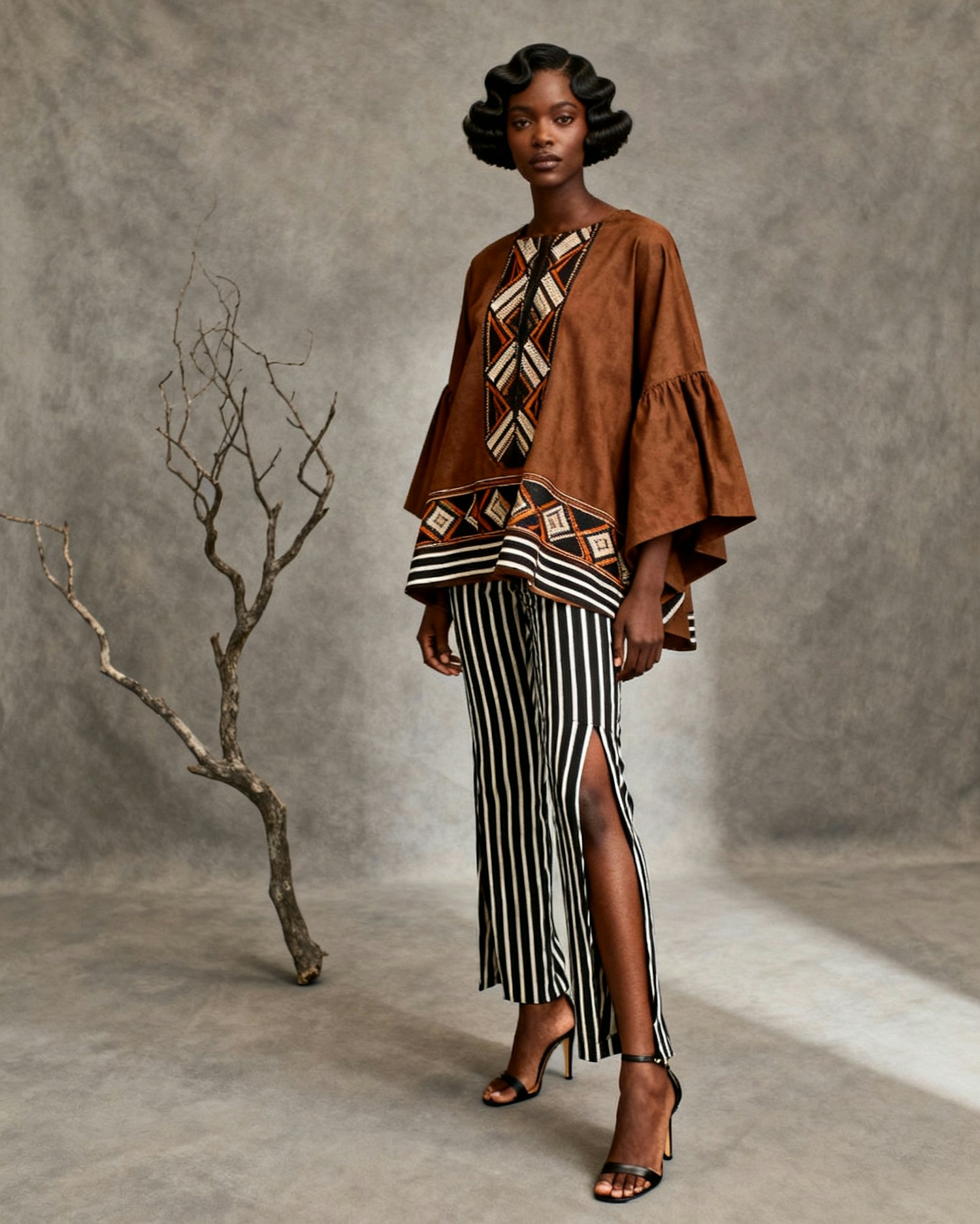 Stylish woman in a patterned brown top and striped pants, posing in a studio with a neutral background and artistic elements.
