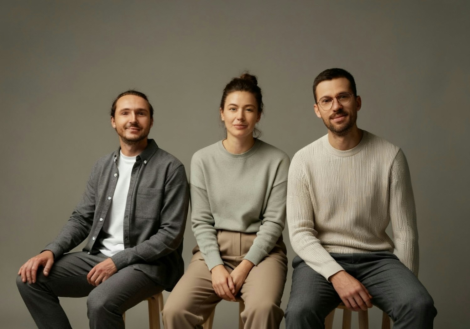 Three casually dressed individuals seated in a studio setting, showcasing a relaxed and friendly atmosphere.