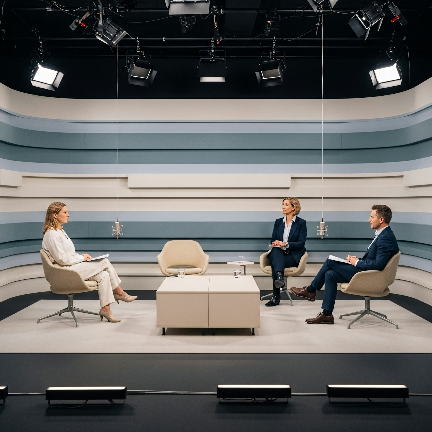 Three professionals in a modern studio setting, engaged in a formal discussion with sleek design and professional lighting.
