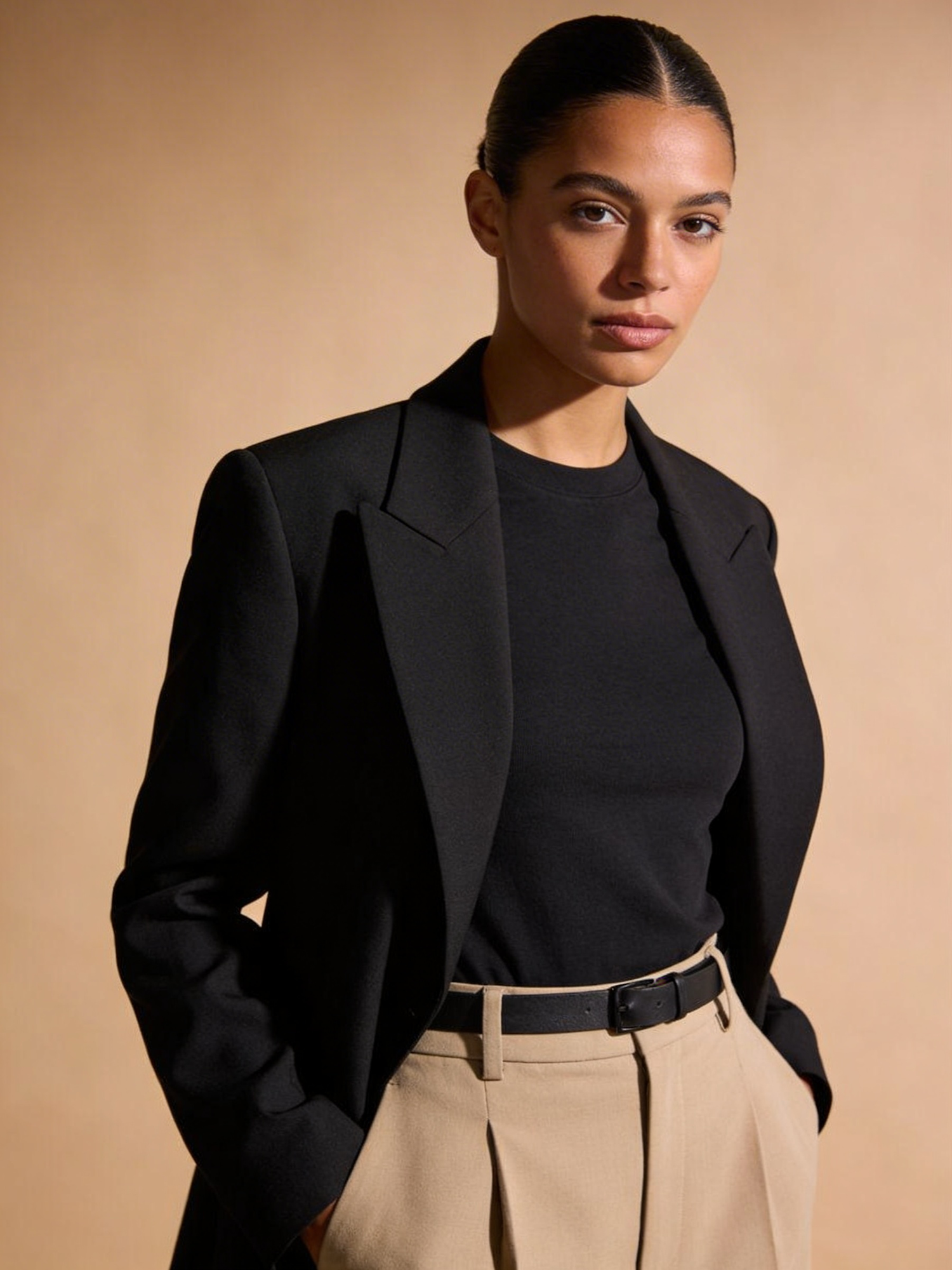 Studio portrait, Scandi-minimal fashion editorial, female early 30s; warm olive skin; sleek low bun with precise center part. Outfit: structured black tailored blazer over a fitted black crewneck top, high-waisted beige tailored trousers with slim black belt (waistline visible), no logos. Framing: waist-up; slight 3/4 angle. Solid muted warm greige seamless backdrop. Rembrandt lighting with soft fill; 105 mm macro-sharp clarity; natural skin texture. Expression: composed, confident, direct gaze.