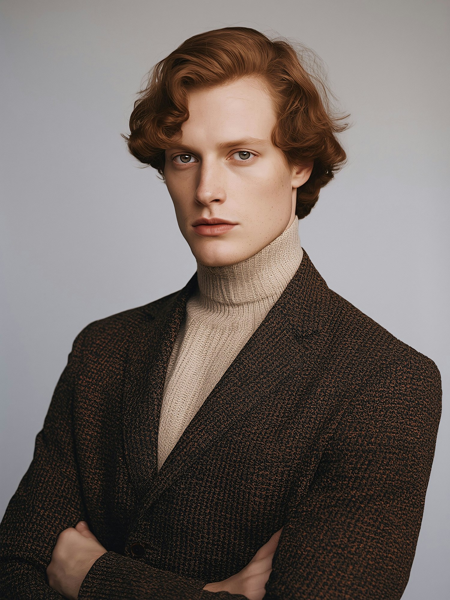 Stylish young man with auburn hair in a brown blazer and beige turtleneck, posing against a neutral background.