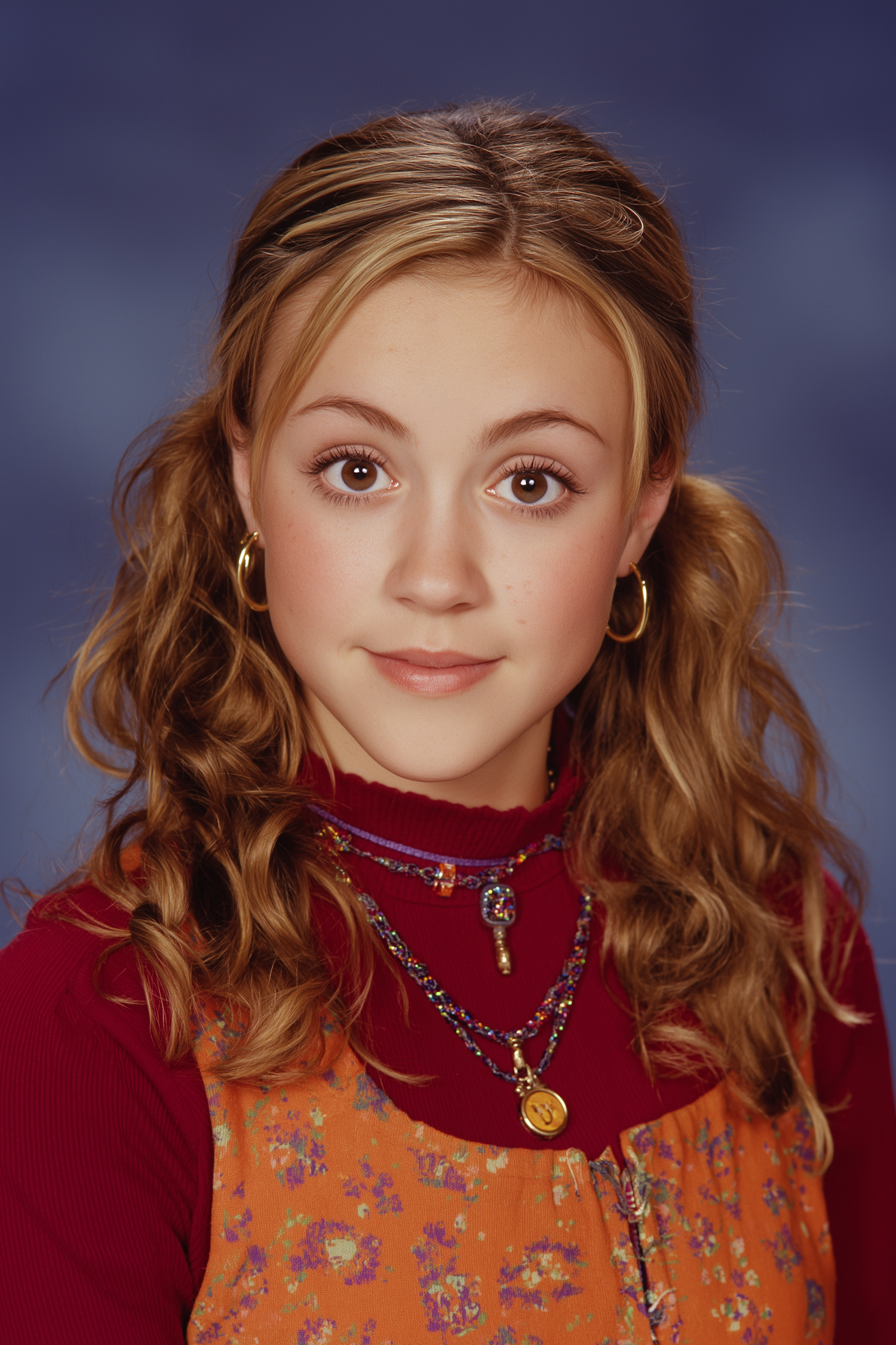 Young woman with wavy light brown hair, wearing a red turtleneck and orange floral dress, accessorized with layered necklaces and hoop earrings.