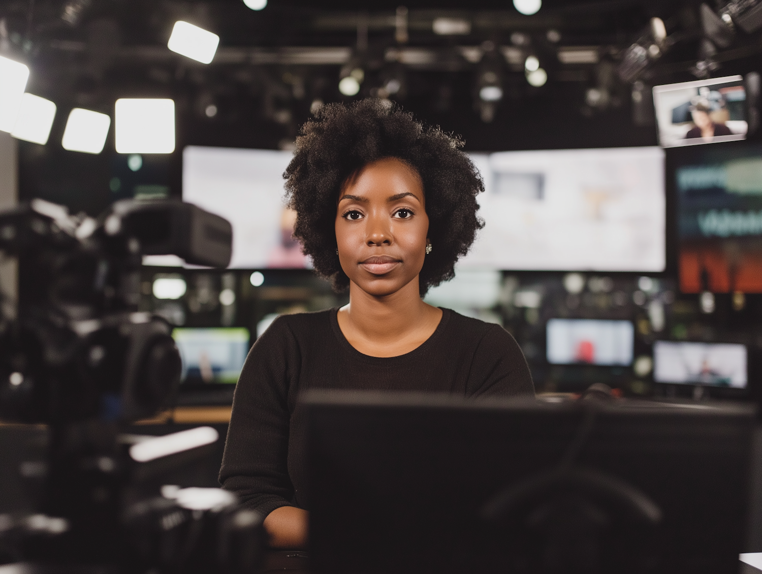Confident Black woman with natural afro hair in a professional studio, surrounded by monitors and cameras, ready for media production.