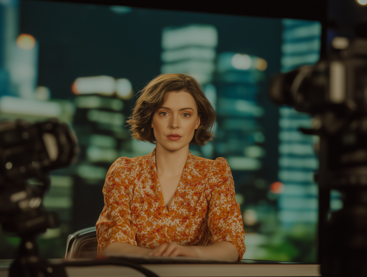 A woman in an orange floral blouse sits in a studio with a blurred cityscape background, framed by professional cameras.