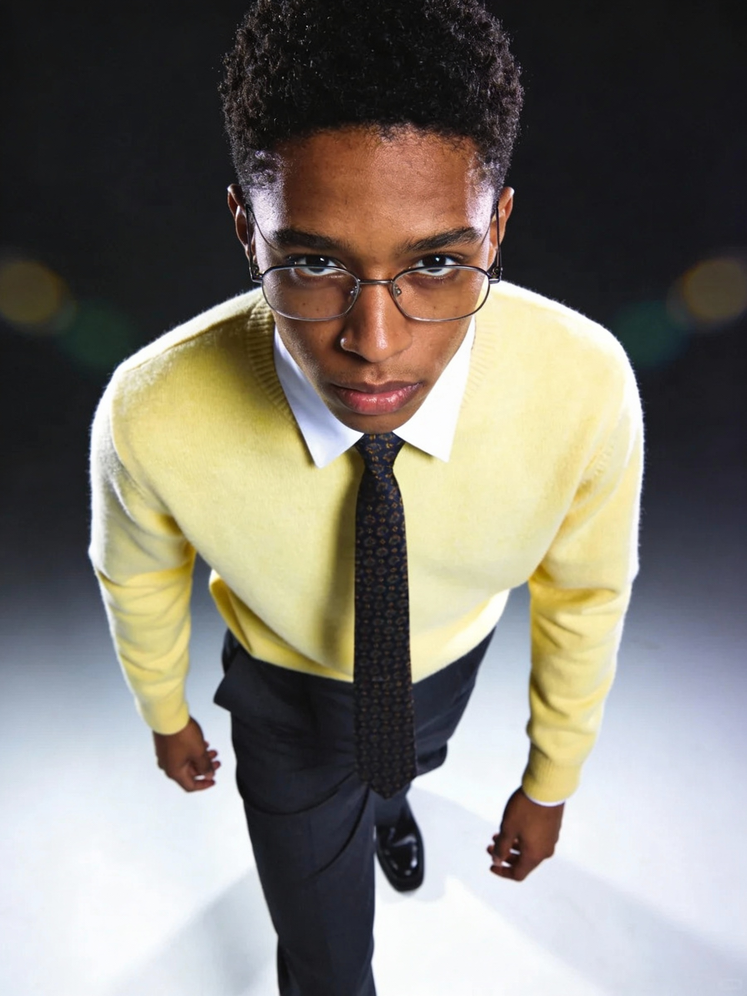 Stylish portrait of a Black person with short curly hair and glasses, wearing a light yellow sweater, white collared shirt, dark patterned tie, and dark trousers. Captured mid‑step with a slight forward lean, hands relaxed, expression cool and unbothered. Glossy Y2K studio lighting with reflective highlights, clean dark backdrop, bold editorial energy.