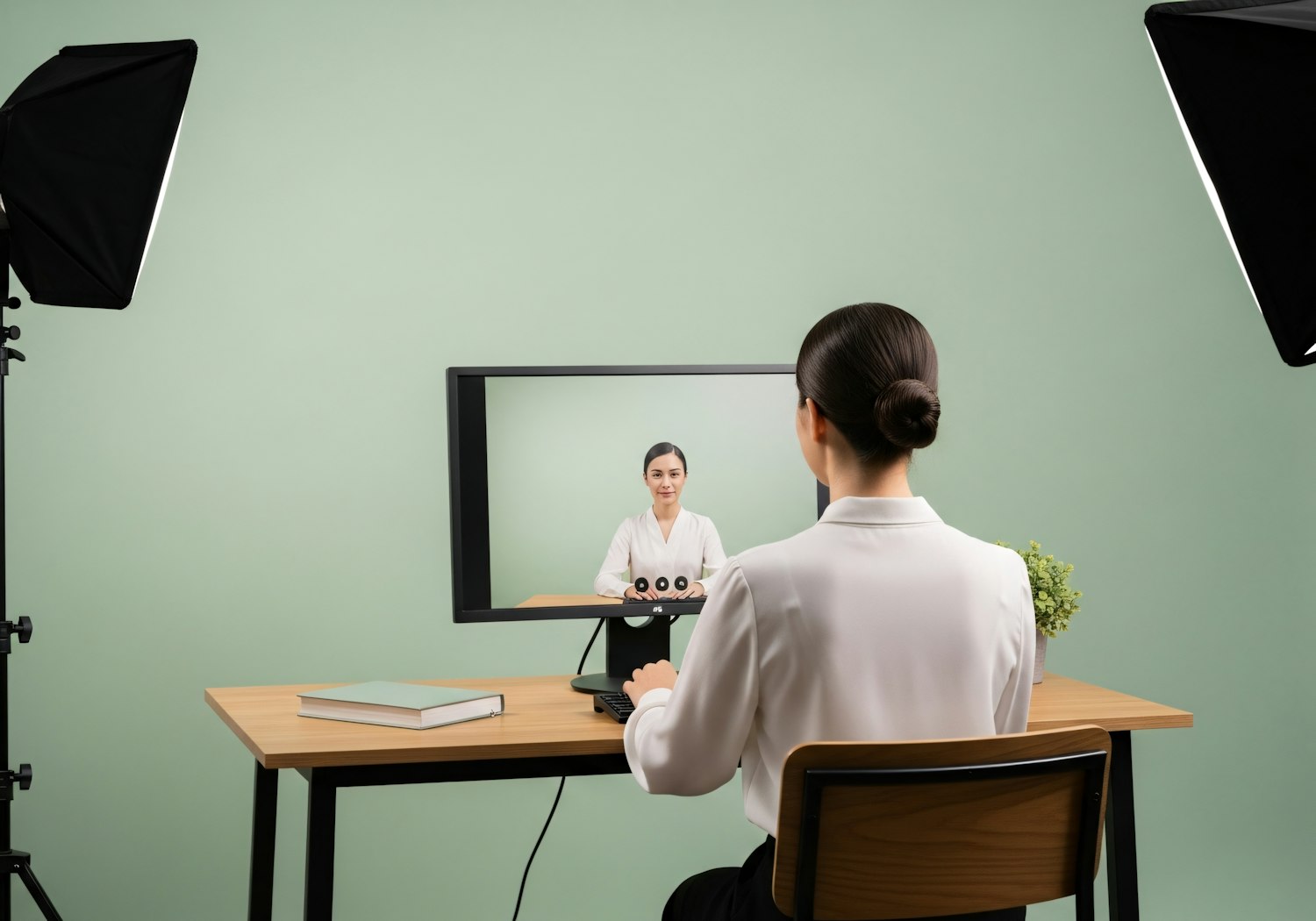 A woman in a studio setup sits at a desk with a monitor, surrounded by professional lighting, creating a clean and professional atmosphere.