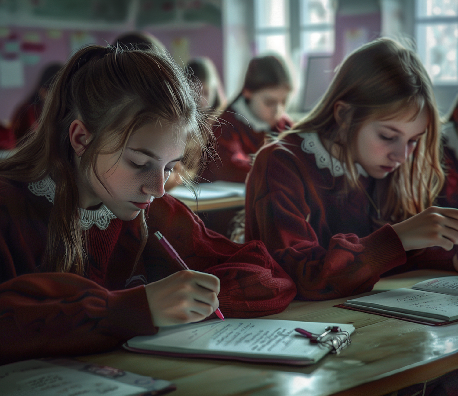 Young students in red uniforms focus intently on writing in a softly lit classroom, creating a studious atmosphere.
