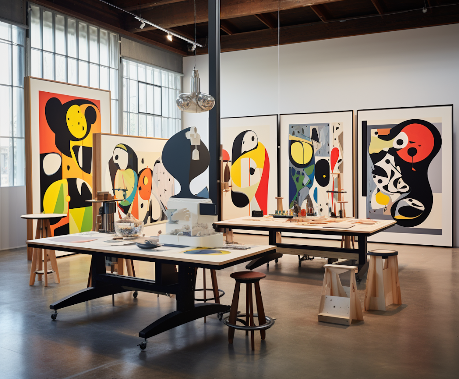 Vibrant art studio with abstract paintings, bold colors, and creative workspace. Natural light enhances the gallery-like atmosphere.