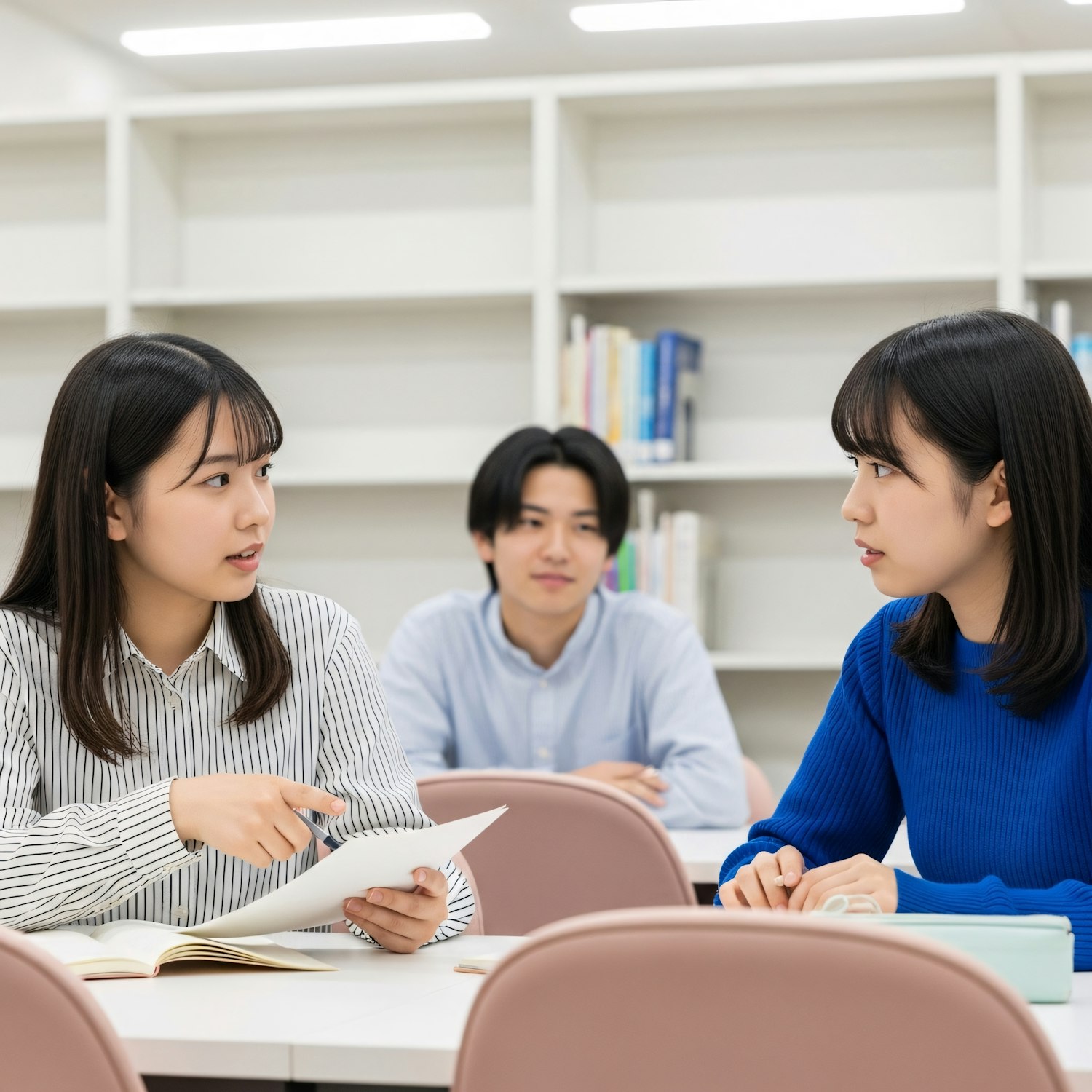 Three students in a library discussing and collaborating on a project, with books and a bright, modern study space in the background.