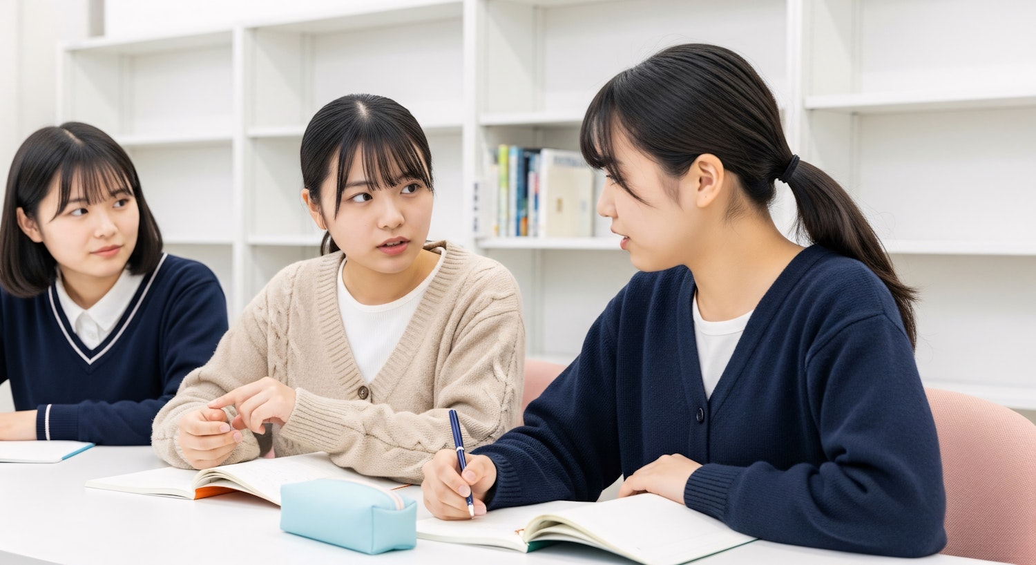 Three young women studying together in a bright library, discussing notes and ideas with open books and a pencil case on the table.