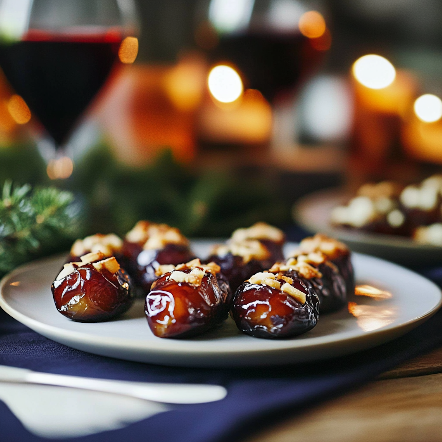 Elegant plate of stuffed dates with nuts, surrounded by candles and wine, creating a cozy, festive atmosphere.