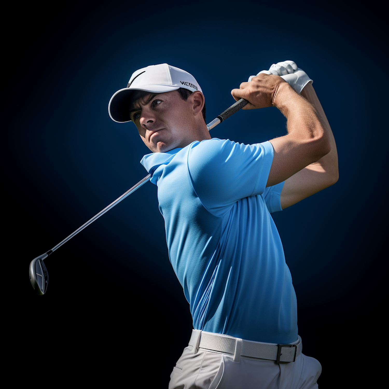 Caucasian male golfer in a blue polo shirt mid-swing, focused expression, dark background, white cap and gloves.