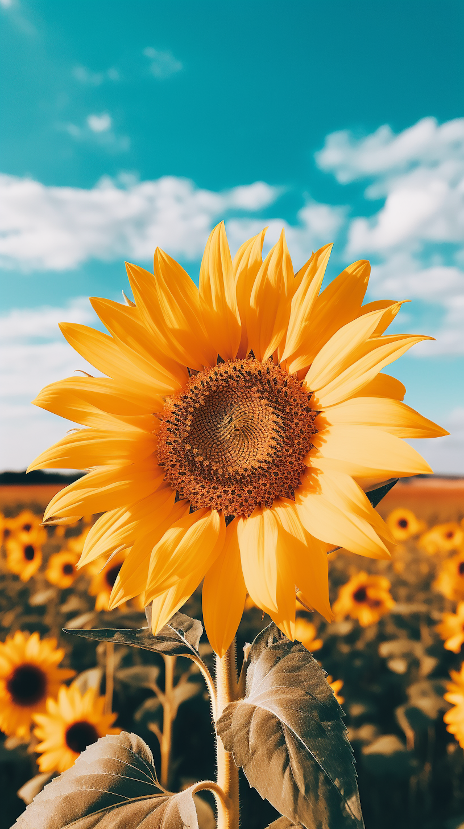 Bright sunflower in focus against a field of sunflowers and a clear blue sky with fluffy clouds.