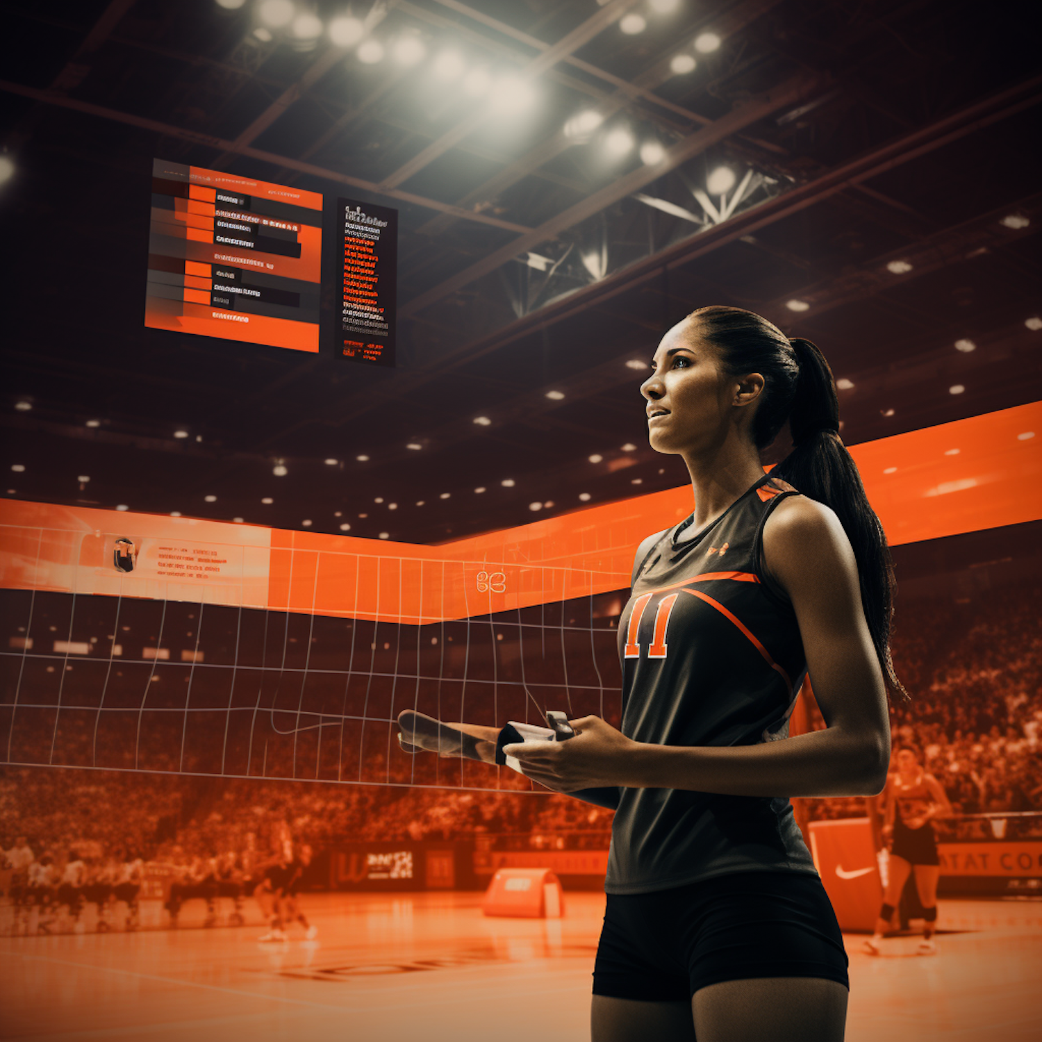 Female volleyball player with tablet on court, wearing black and orange uniform, digital scoreboard above, dynamic indoor arena setting.