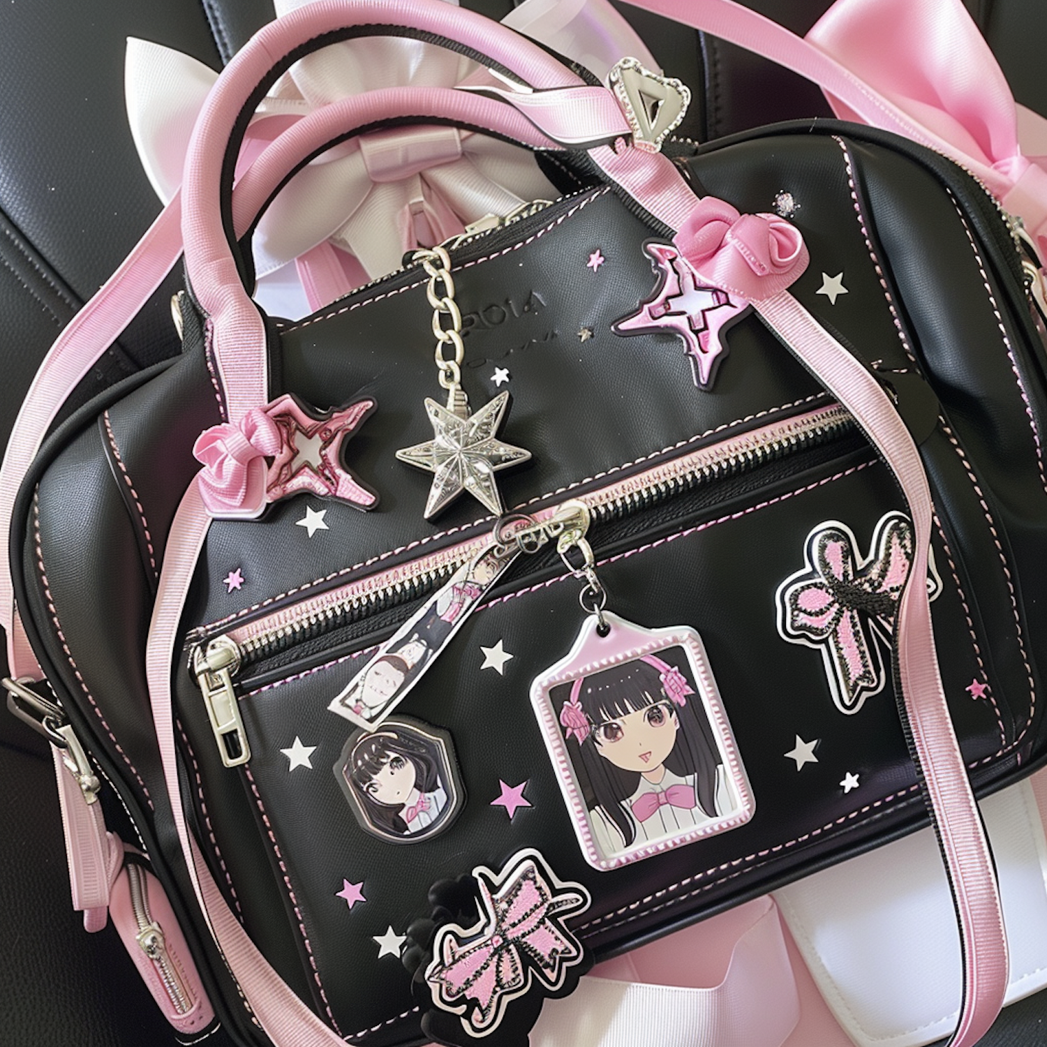Chic black handbag with pink accents, star and bow embellishments, and anime character keychains, set against a pink and white background.