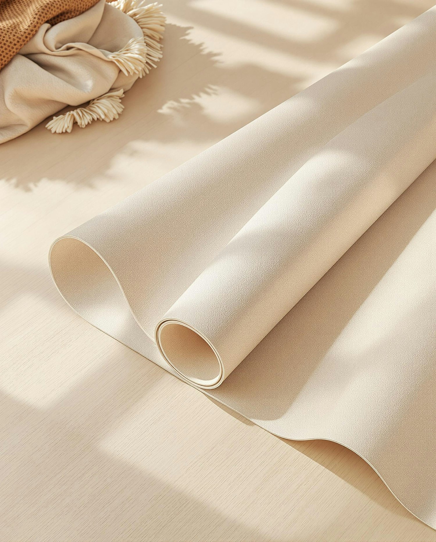 A yoga mat in beige linen texture partially unrolled on a light wooden floor, a neutral-toned throw blanket folded nearby, indirect sunlight coming from the side, peaceful and minimalist vibe, editorial interior design photo