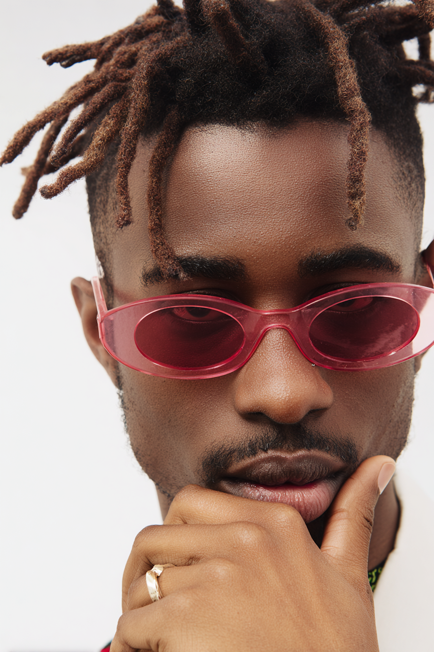 Close-up image of a stylish individual wearing pink oval sunglasses and a gold ring, set against a neutral background.