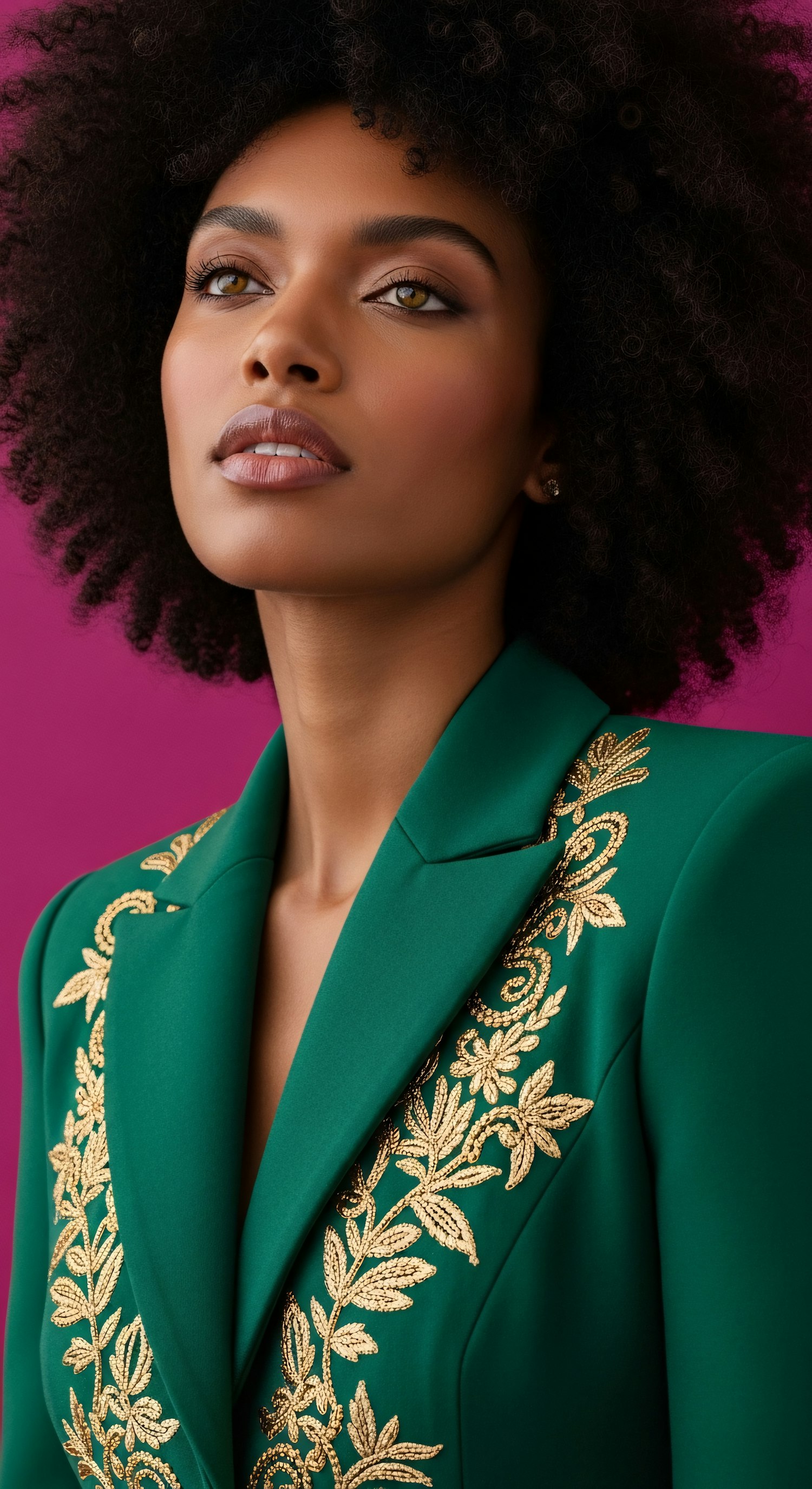 A person with natural curls in a green jacket with golden embroidery, set against a magenta background, radiating elegance.
