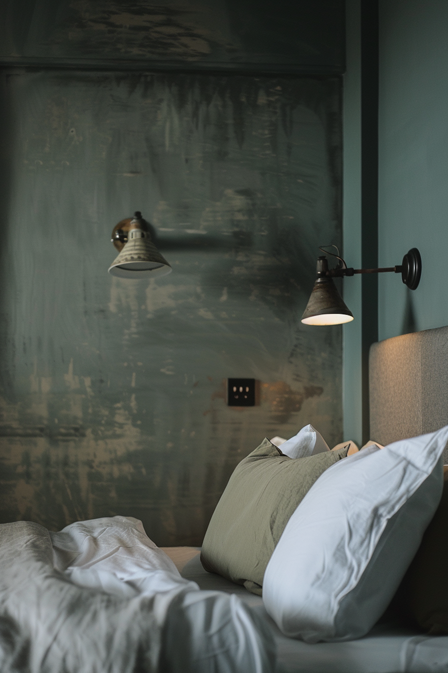 Minimalist bedroom with textured green walls, industrial lamps, and cozy bedding in white and olive tones for a serene ambiance.