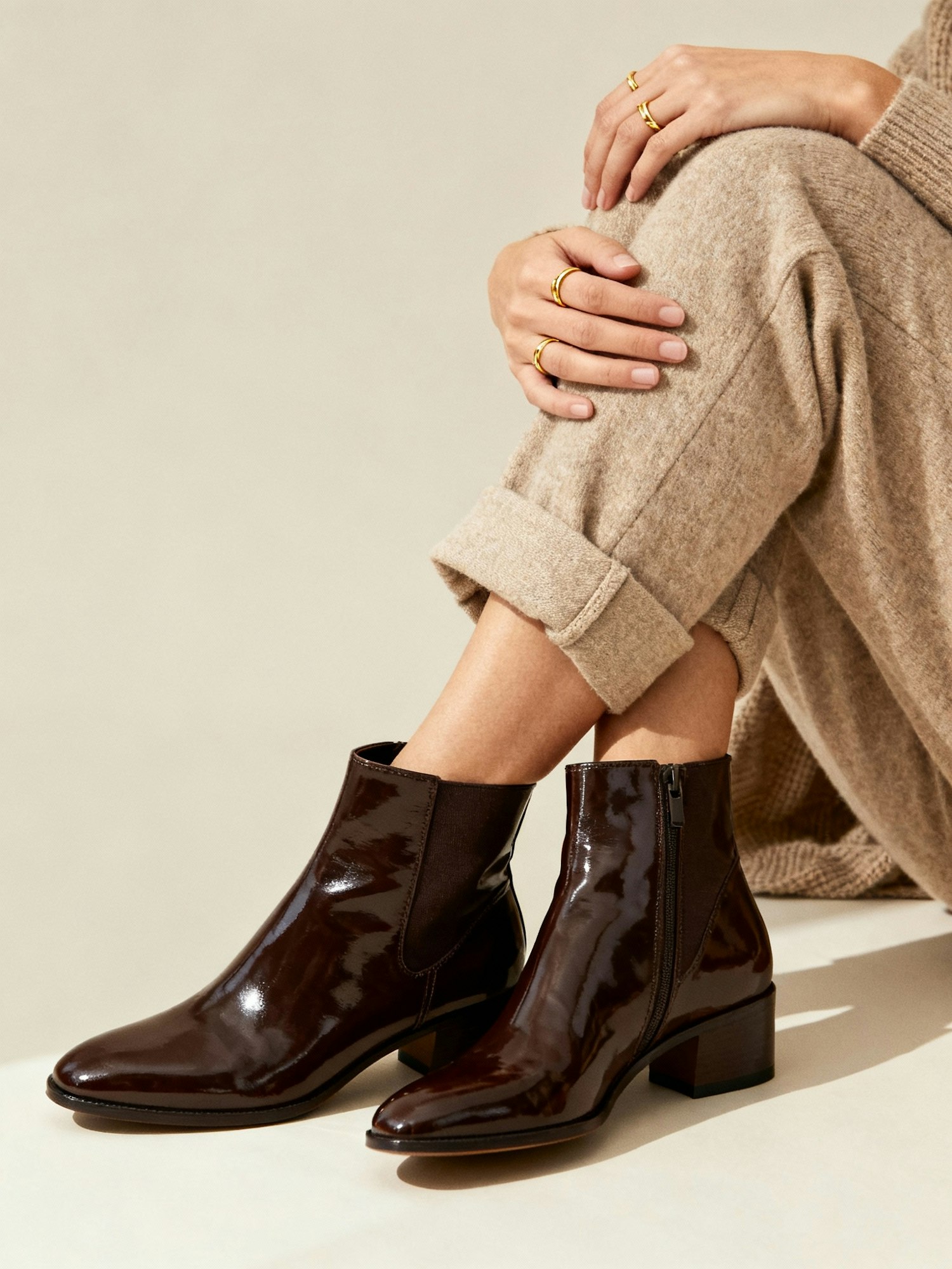 Stylish dark brown leather ankle boots paired with beige knitwear, featuring gold ring accessories on a neutral background.