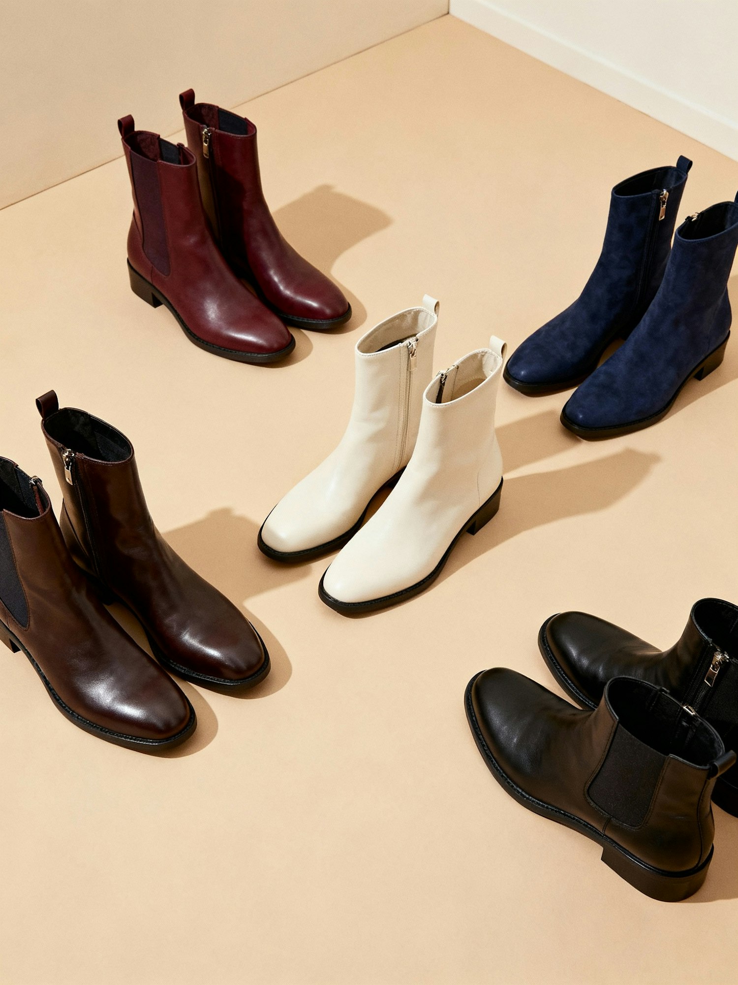 A stylish display of ankle boots in burgundy, navy, white, and black, arranged on a beige surface, showcasing their sleek design and quality.