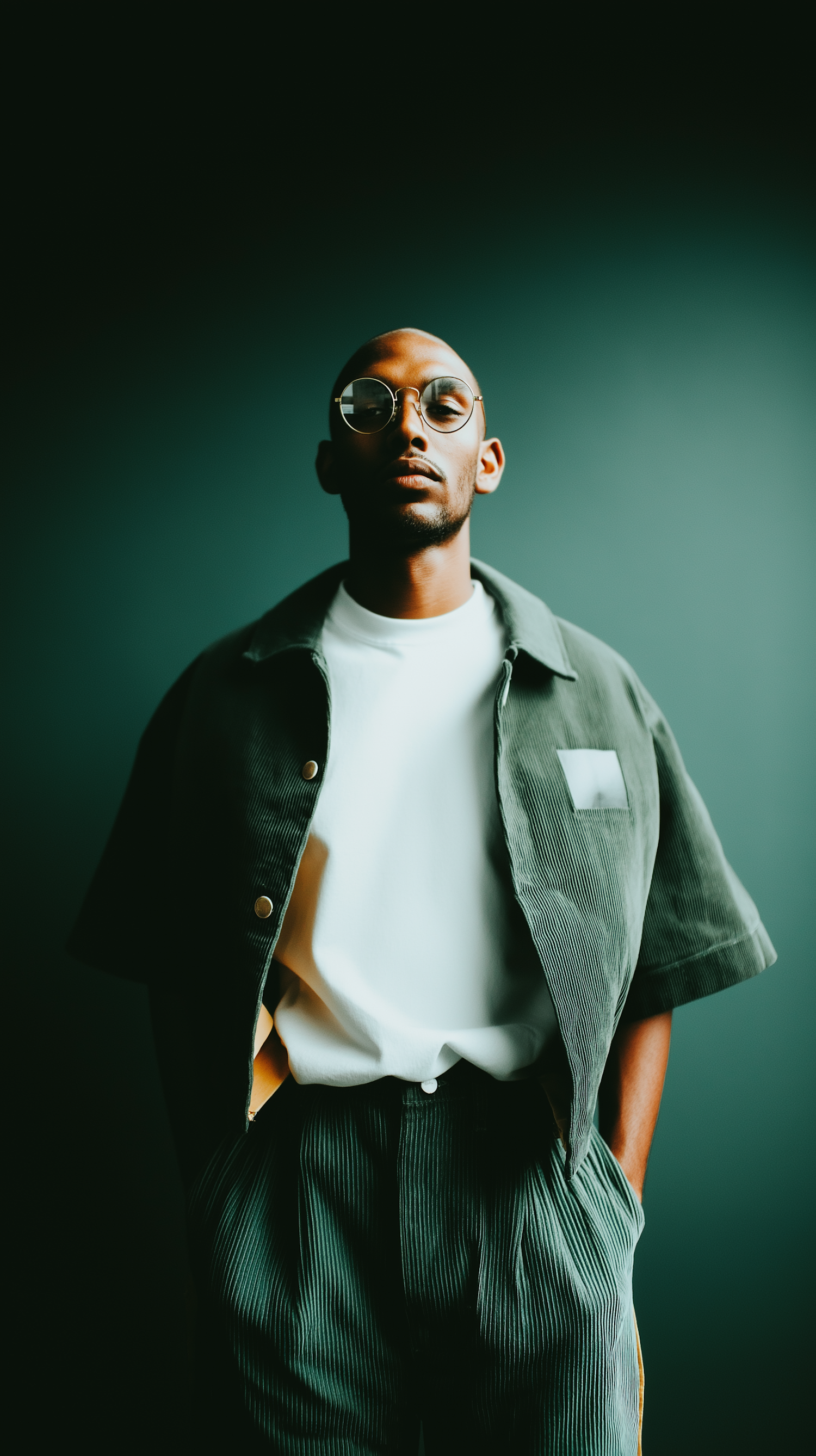 A person dressed in a green corduroy jacket and striped trousers, exuding style against a clean background illustrating simplicity.