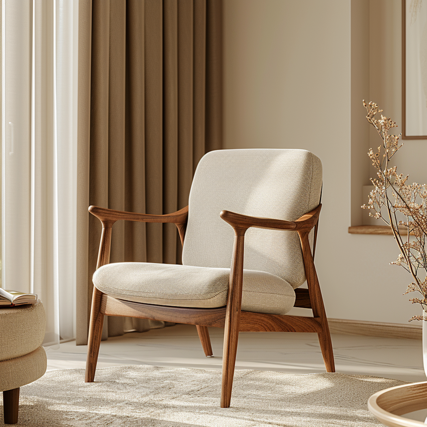 Mid-century modern armchair with wooden frame and beige upholstery in a sunlit room with elegant curtains and minimalist decor.