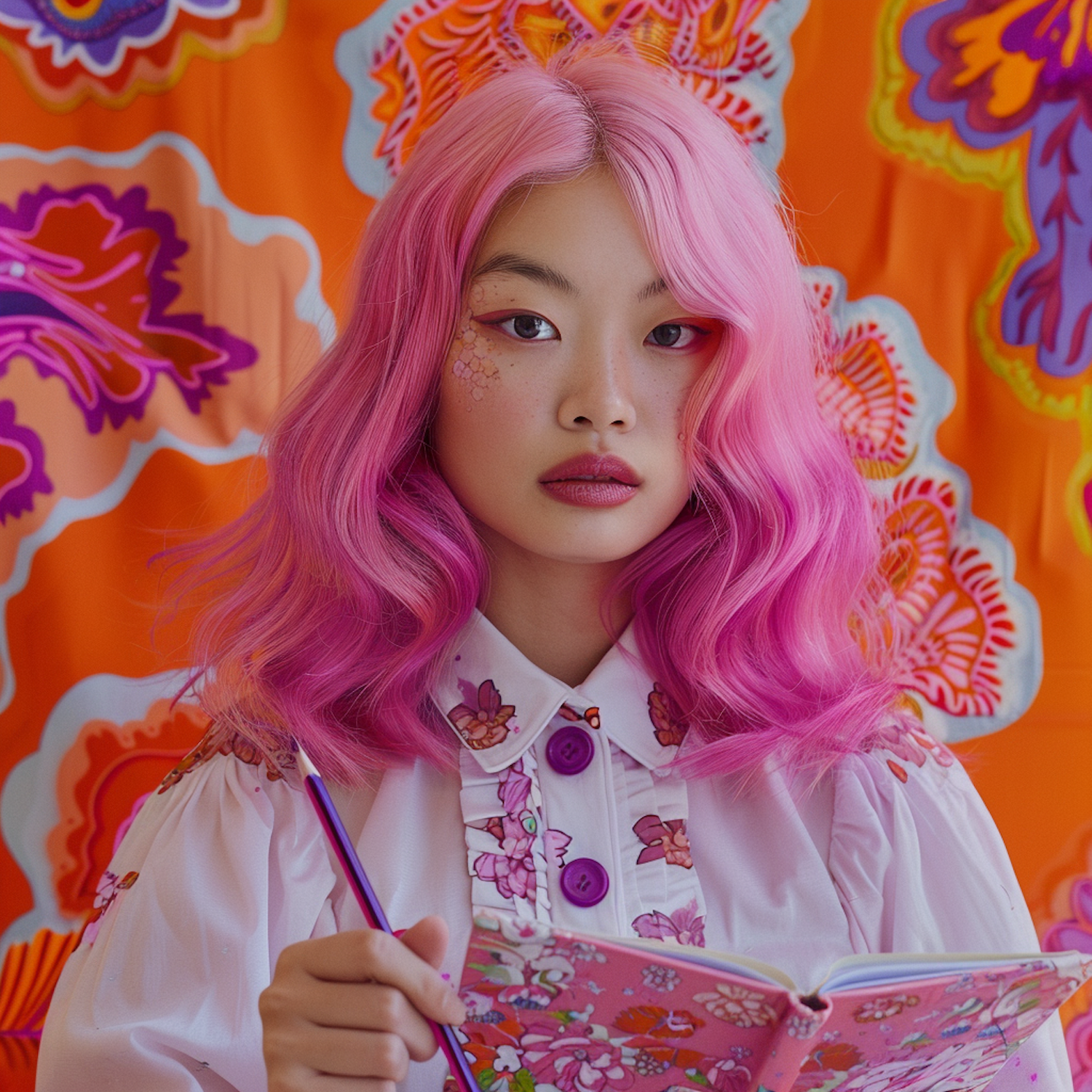 Vibrant portrait of a woman with pink hair, floral makeup, and a matching notebook against a bold orange floral background.