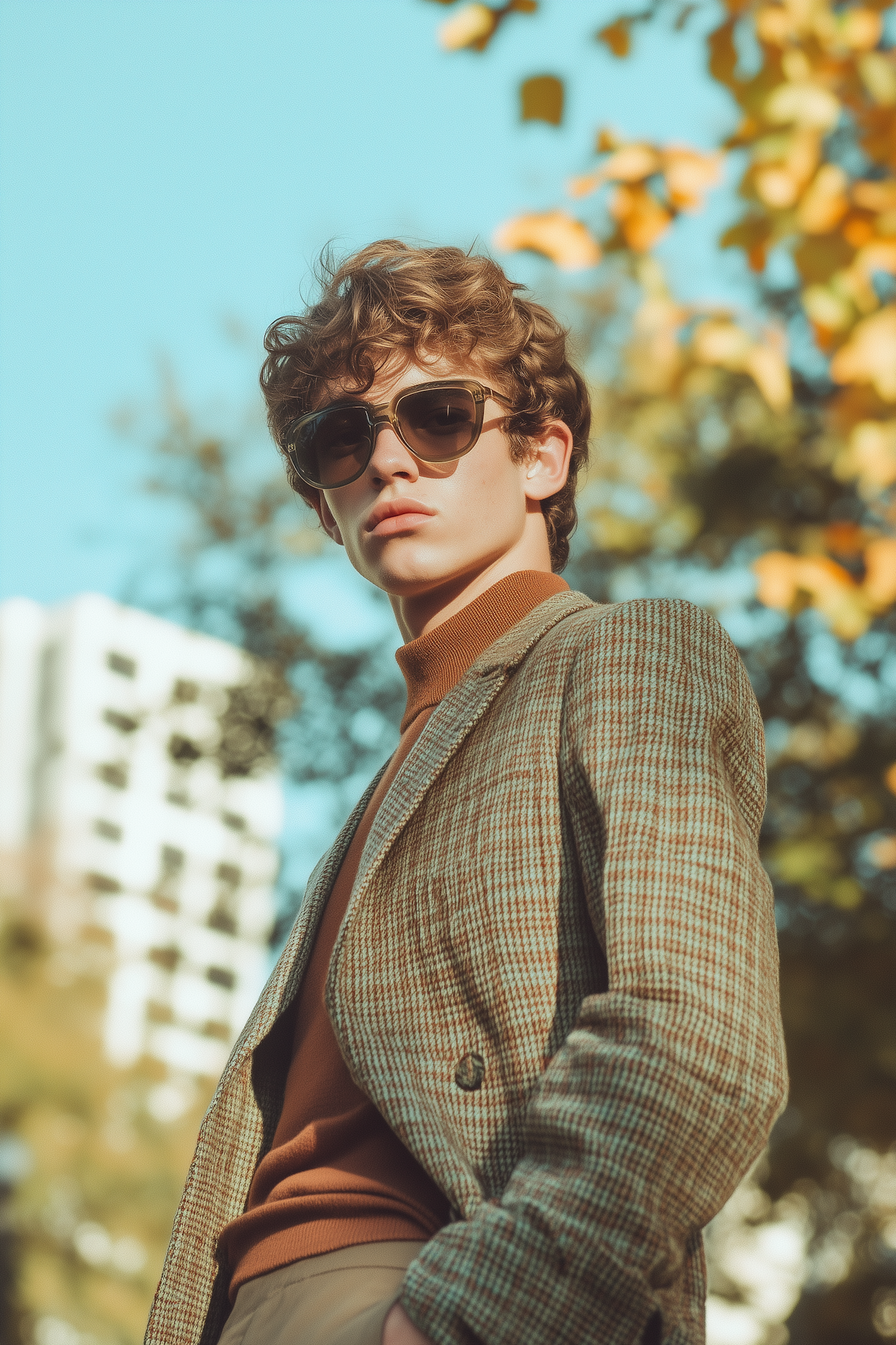 Stylish young man in sunglasses and checkered blazer, set against a clear blue sky and autumn foliage. Fashionable urban vibe.
