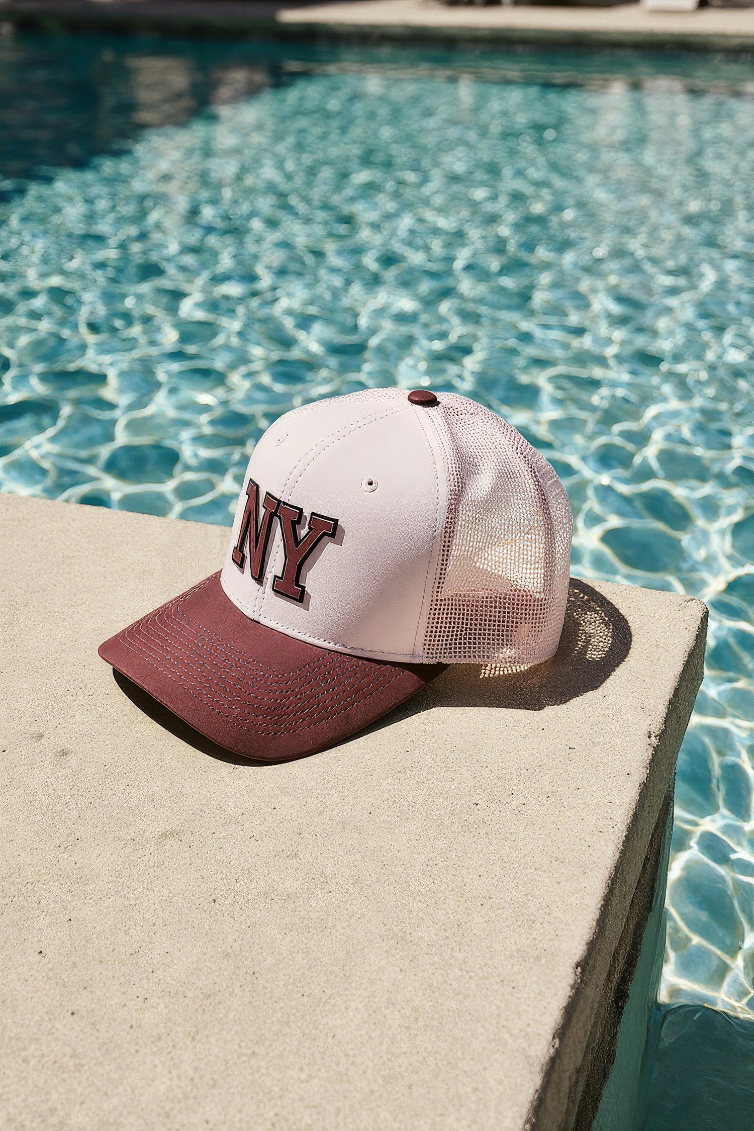 A maroon and white 'NY' baseball cap sits on a poolside ledge, with sunlight reflecting off the rippling blue water.