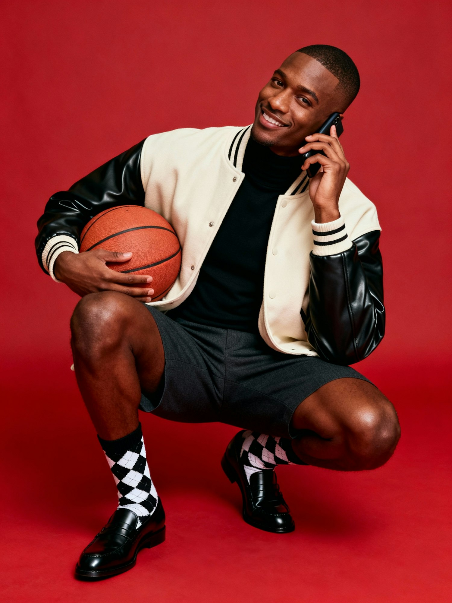 A stylish man kneels with a basketball, wearing a varsity jacket and patterned socks, set against a bold red background.