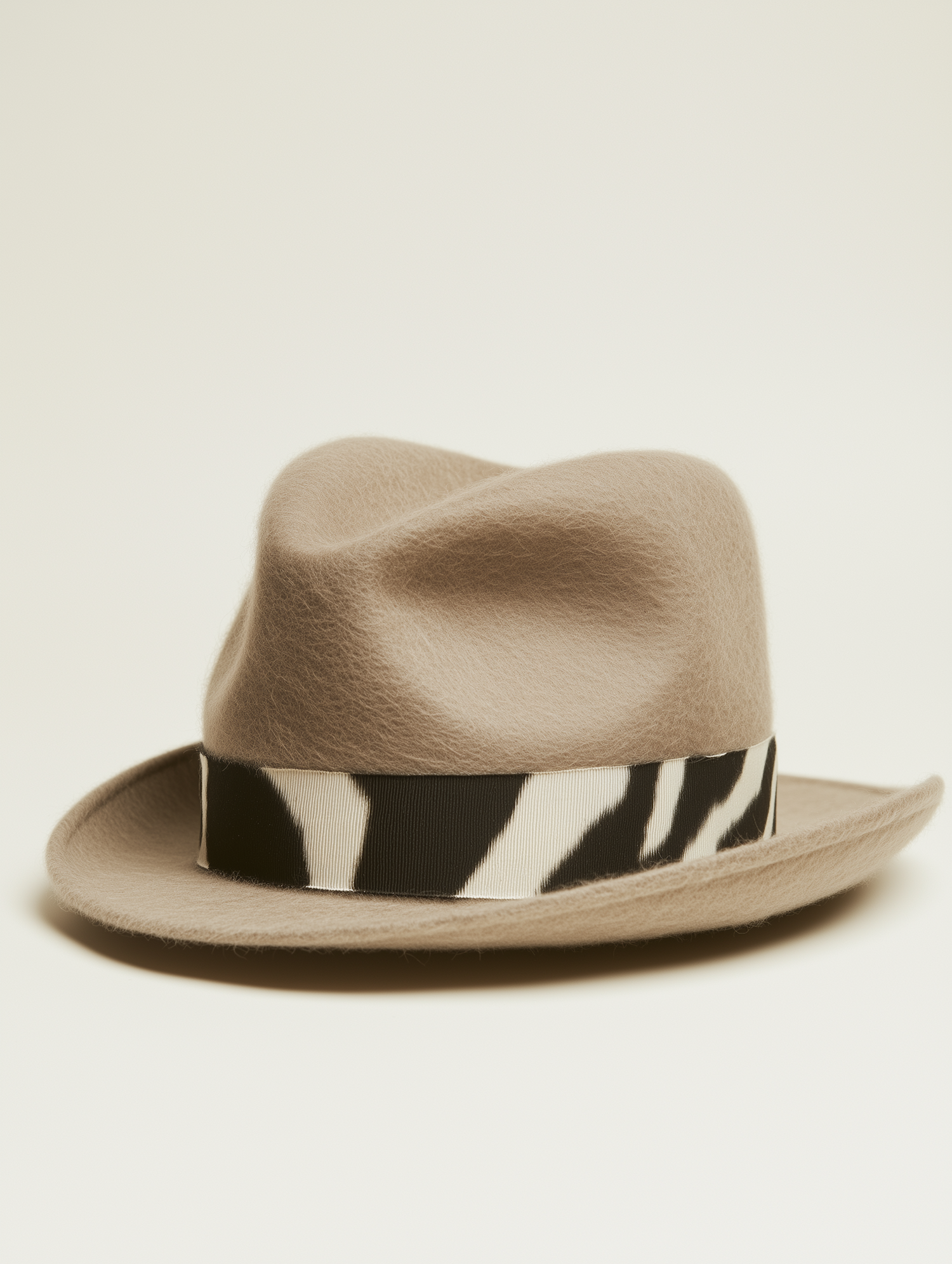 Beige fedora hat with a zebra-striped band, perfect for adding a bold touch to your outfit. Classic design with a modern twist.