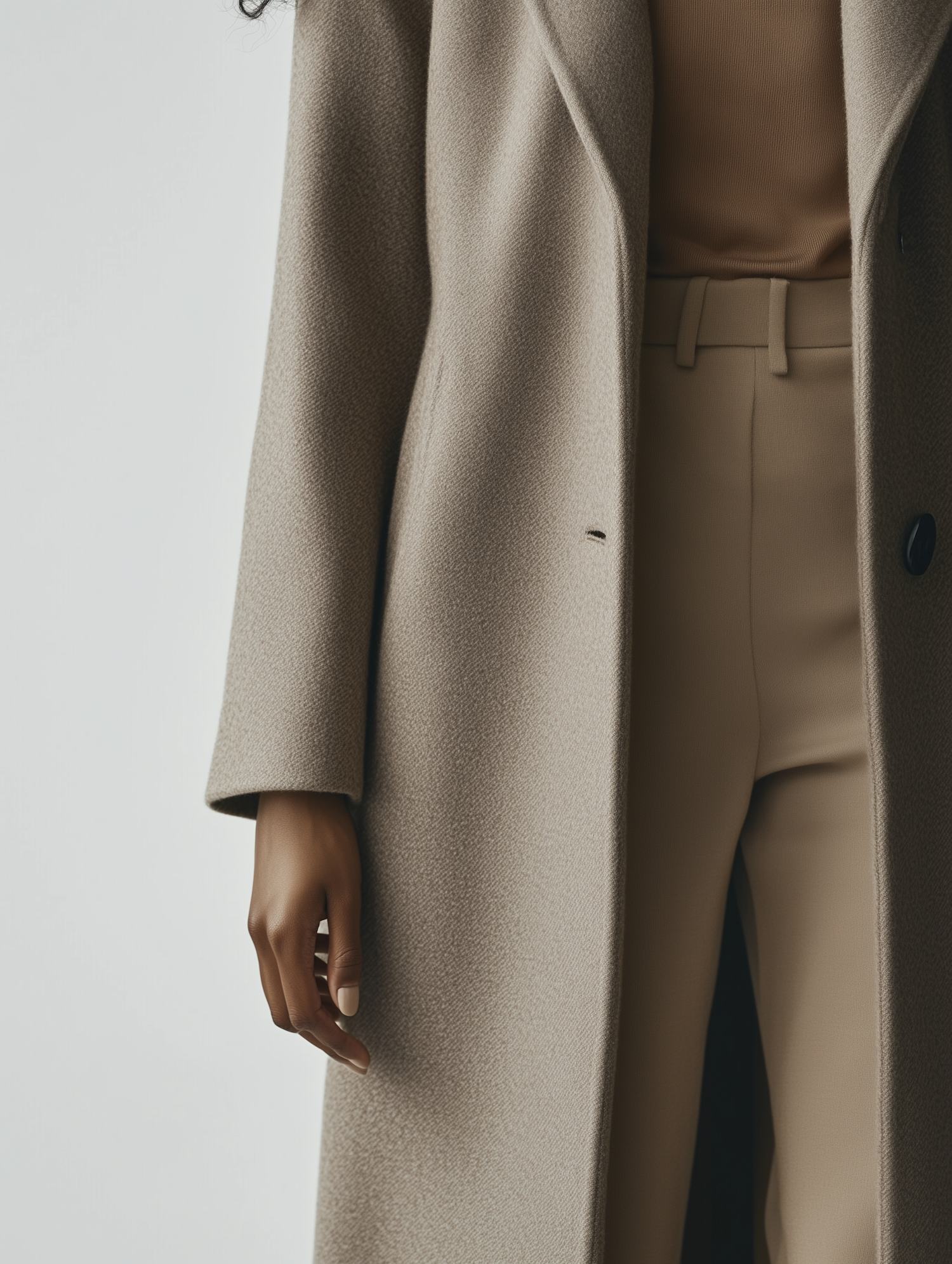 Chic beige wool coat paired with matching outfit, showcasing minimalist elegance and modern style.