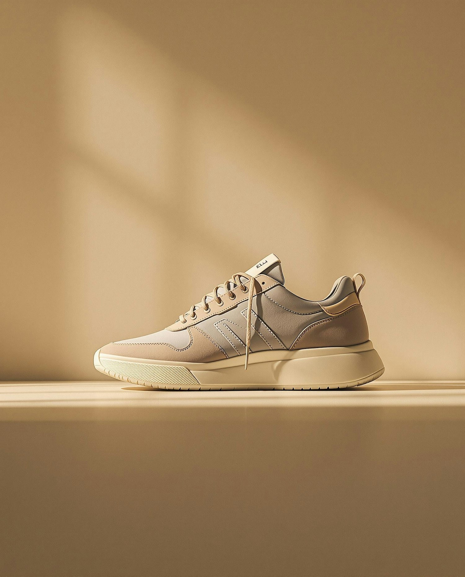 Minimalist beige sneaker with sleek leather panels, subtle stitching, and soft lighting for a modern, stylish look.