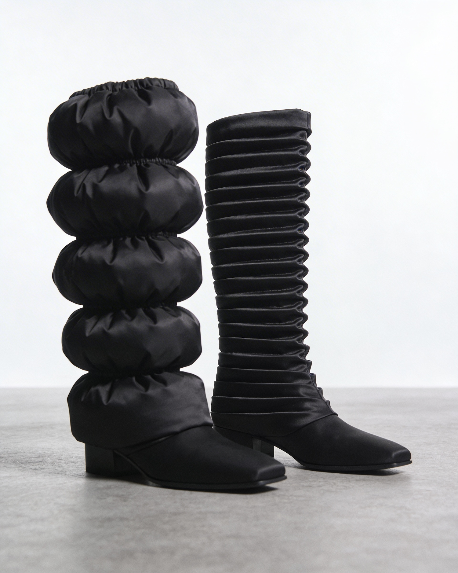 One boot has exaggerated balloon‑like folds, the other has tighter accordion folds—same silhouette family, different volume.
