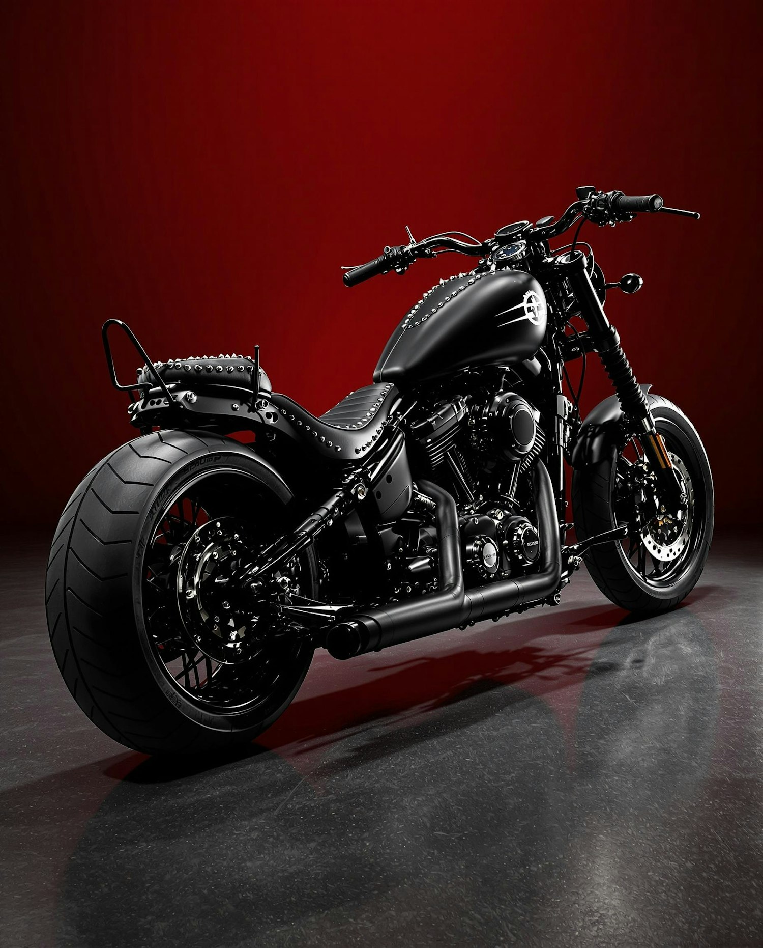 Matte black custom motorcycle in a red studio setting, metallic details, studded leather seat, chains and spikes, dramatic low lighting and shadows, cinematic and edgy atmosphere.