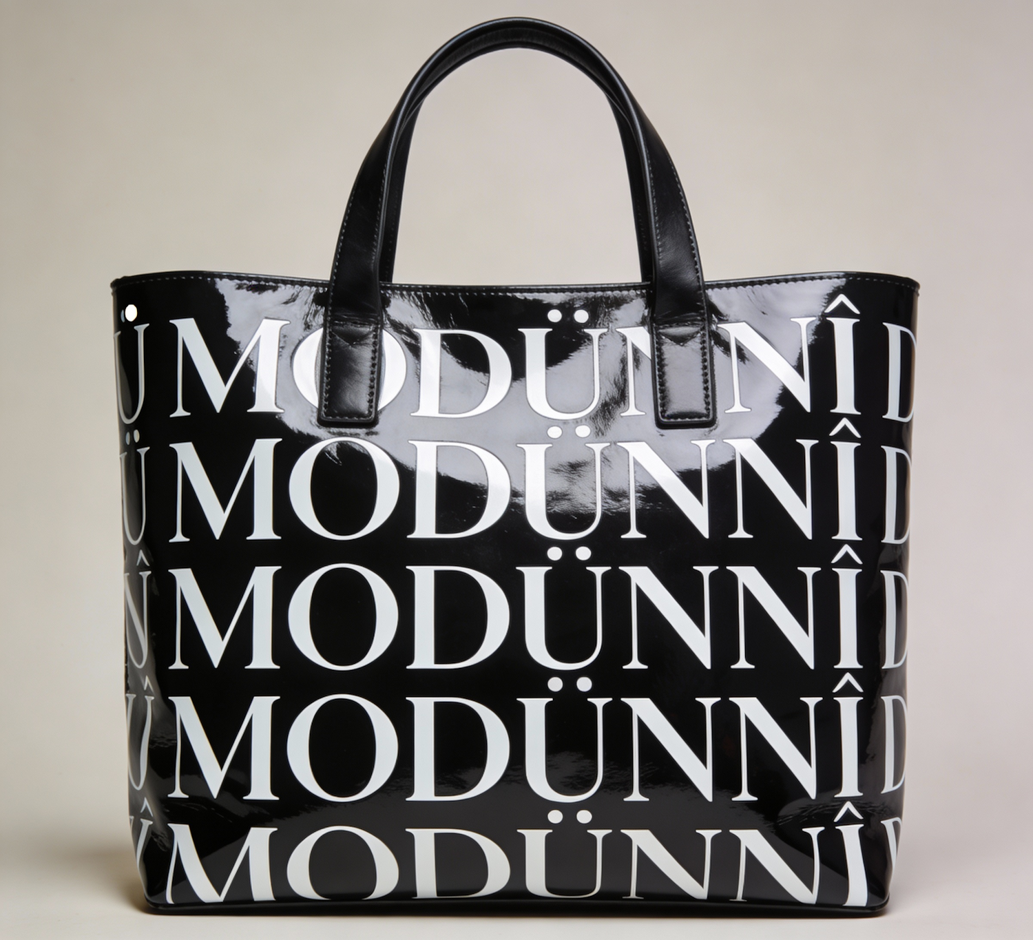 Create a high-fashion tote bag made of shiny black leather with a reflective finish. The surface features a bold, all-over print of the word “MODÙNNÌ” in uppercase serif font, inspired by a hand-drawn sketch. The print is arranged in a grid-like layout with alternating orientations and staggered breaks such as “MODÙ”, “NNÌ”, and “DÙNNÌ” to add rhythm and texture. The typography is printed in matte white, sharply contrasting against the glossy black background. The bag should appear structured and elegant, photographed against a neutral backdrop to emphasize its material and graphic design.