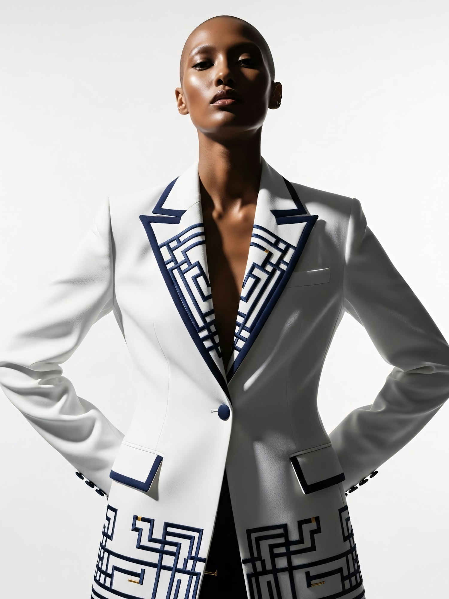 A stylish individual in a white blazer with navy geometric patterns, showcasing modern fashion with a confident and poised expression.