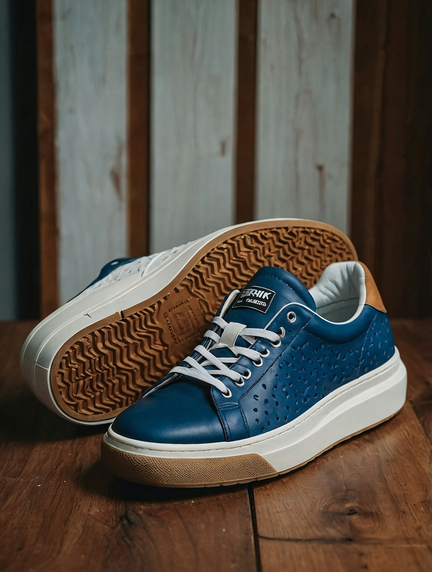 Stylish blue leather sneakers with perforated sides, white laces, and gum soles on a wooden surface. Perfect blend of casual and chic.